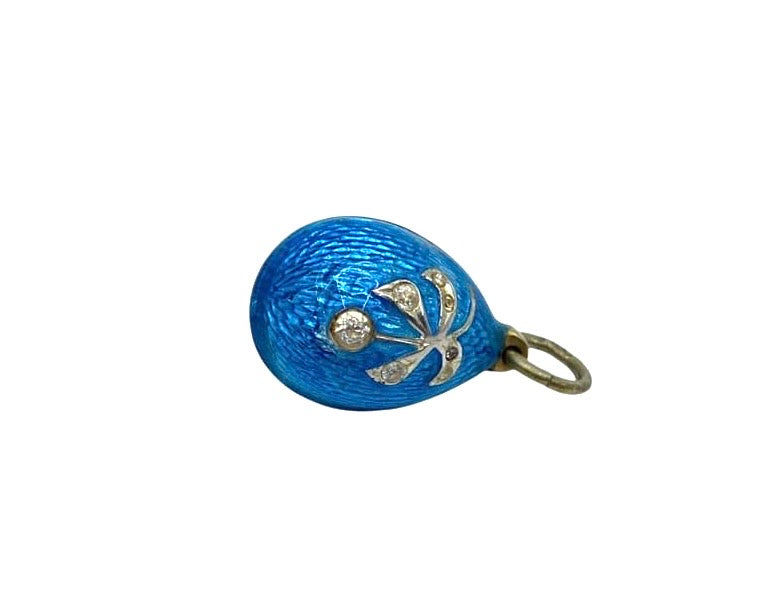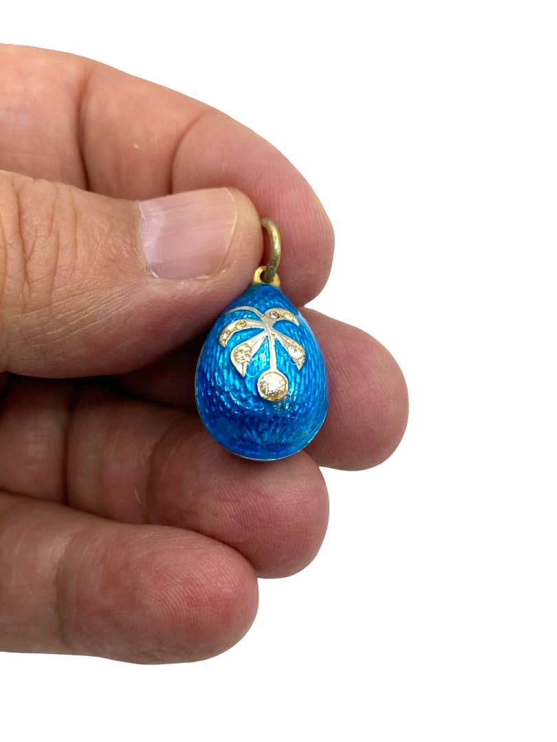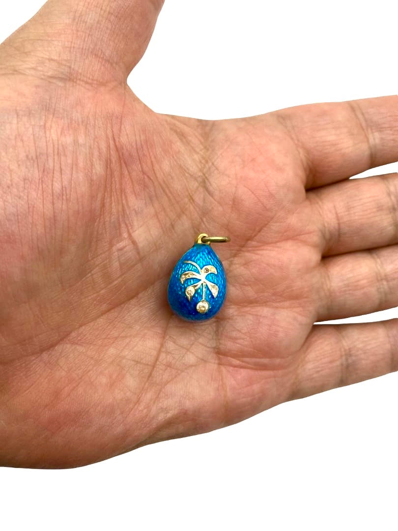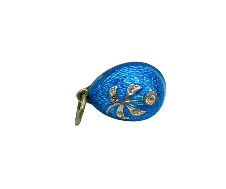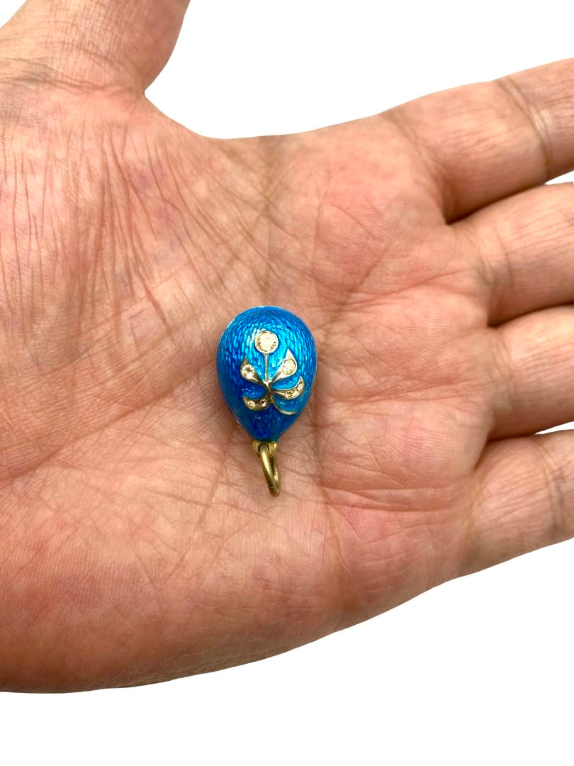 A gilt silver egg pendant by Fabergé master Anders Johan Nevalainen, enameled in azure guilloché and featuring a relief image of a berry on a branch set with seven simulated diamonds, was made in St. Petersburg, Russian Empire, in the late 19th/early 20th century. Anders Johan Nevalainen is one of the most famous Finnish jewelers of the late 19th/first quarter of the 20th century. He collaborated with the Fabergé jewelry company. He was born on January 1, 1858, in Pielisjärvi, Grand Duchy of Finland. From 1874, he worked in St. Petersburg: from 1875 - as an apprentice goldsmith and from 1885 - as a master goldsmith. At first, he worked in the workshop of August Holmström; later, he became an independent master, working exclusively for the Fabergé company. The bow was engraved with the initials "A.N" of the master builder and, to the right, the head of a woman with a kokoshnik and the "88" silver standard of Imperial Russia, the hallmark for the highest quality silver objects, established in 1847.