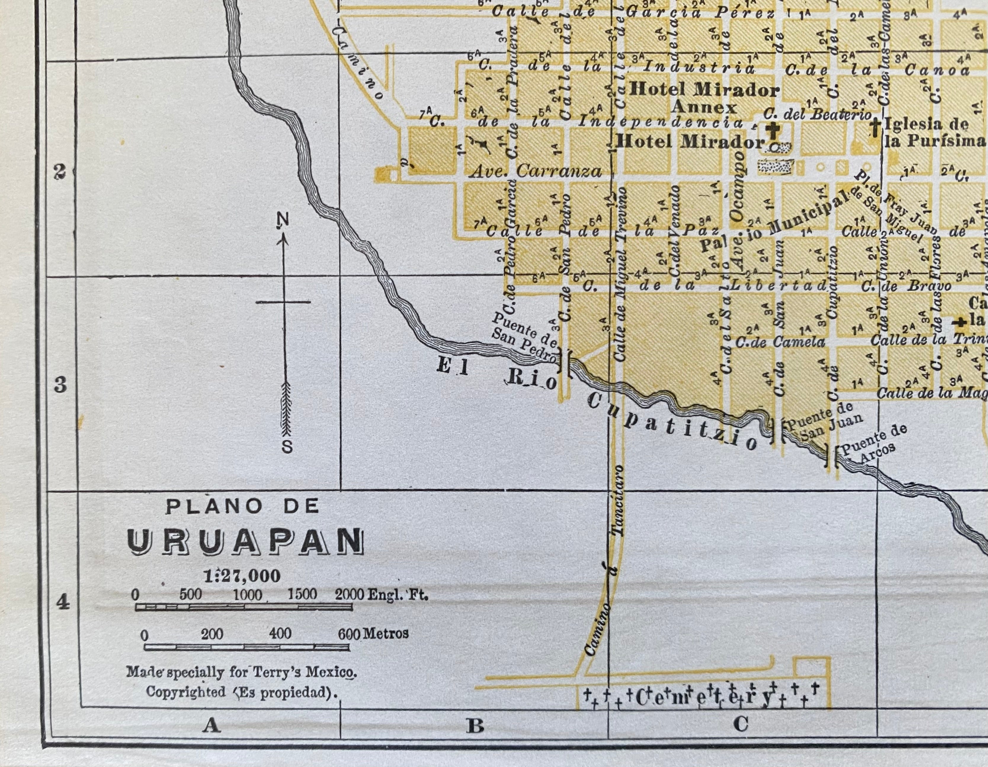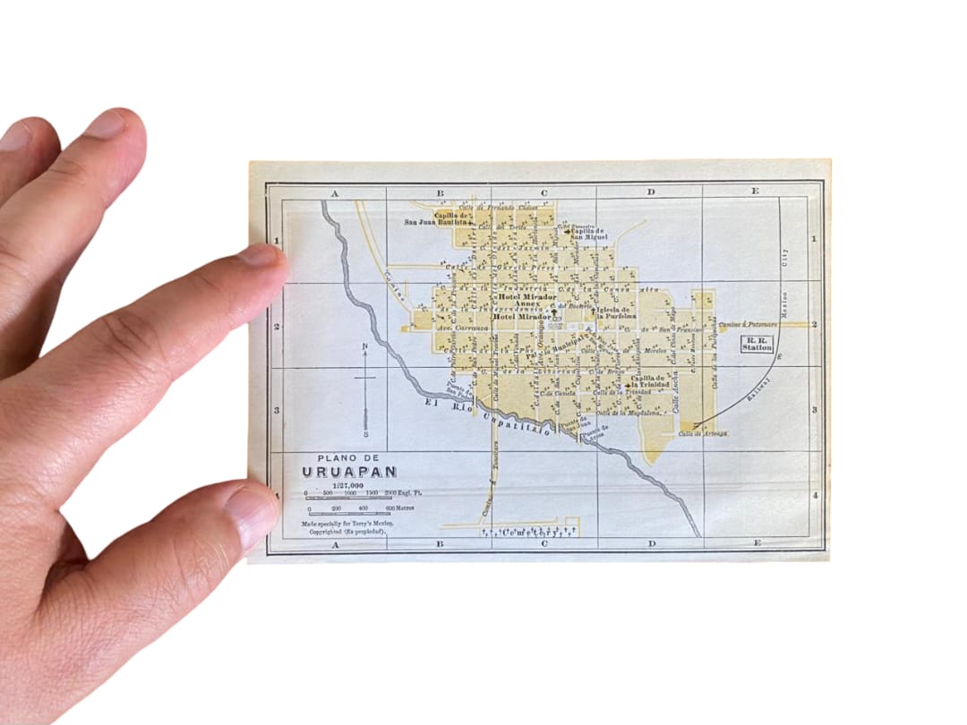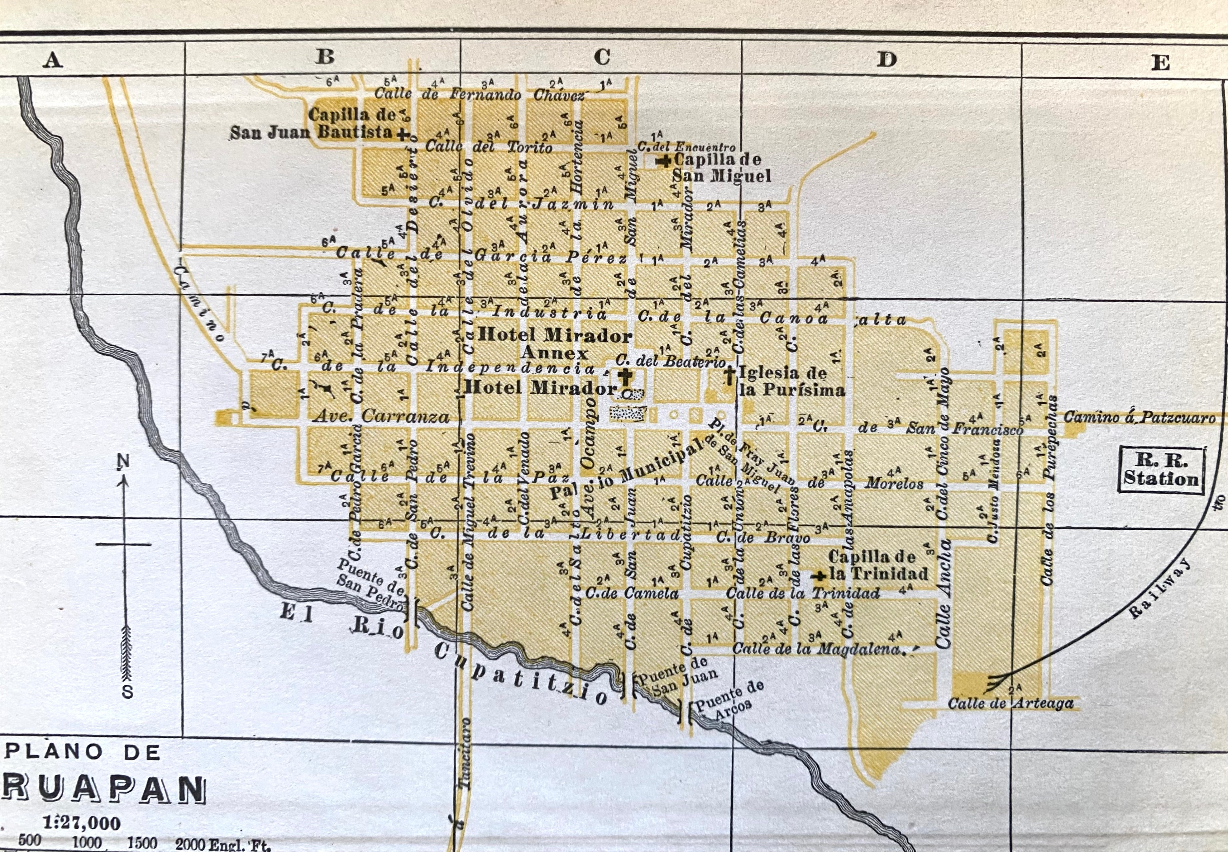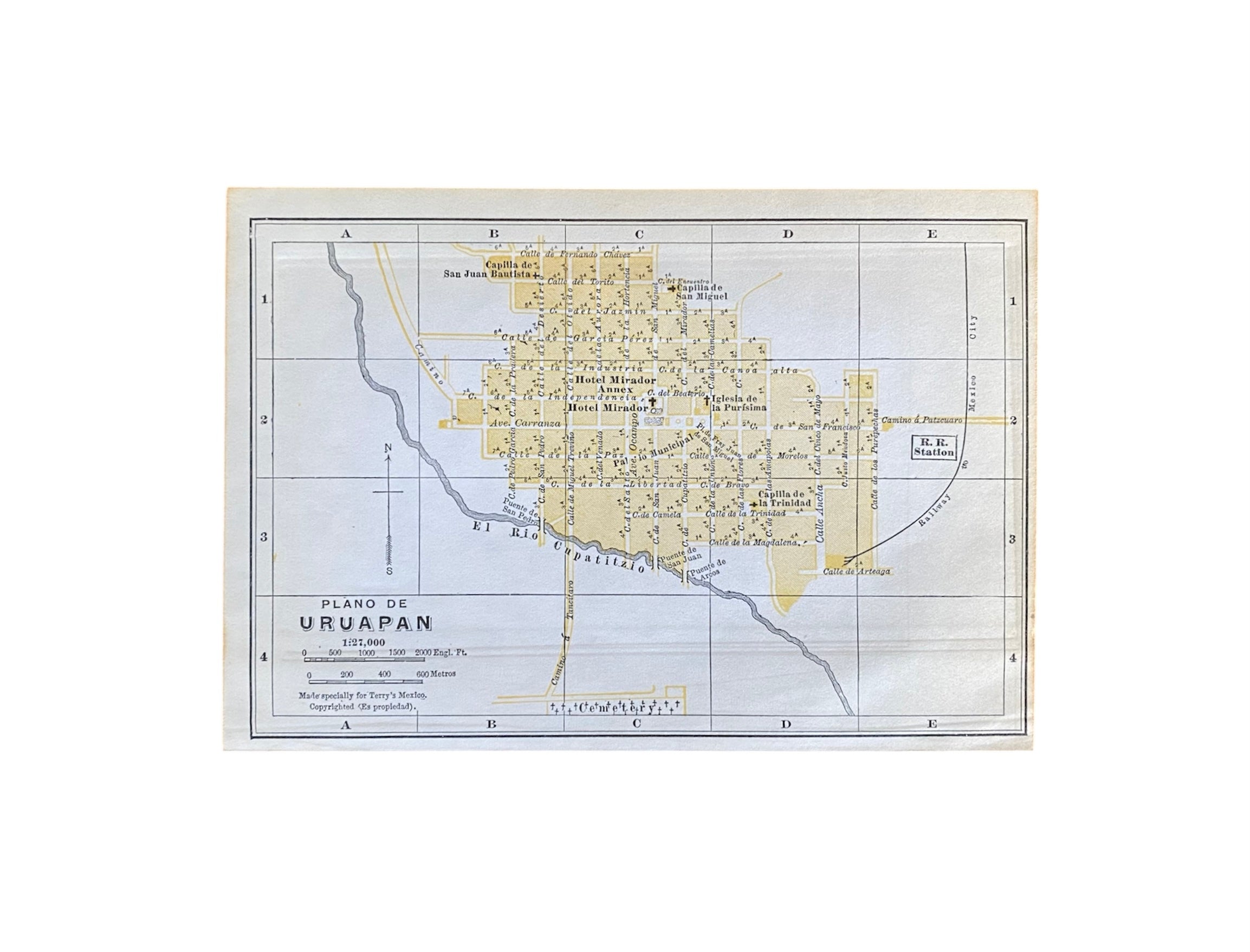 Beautiful and original, Plano de URUAPAN, Mexico. Mapa de la ciudad. City/town plan 1938 old. Vintage tourist map.