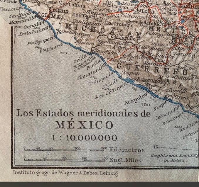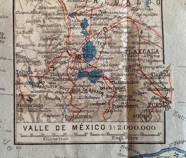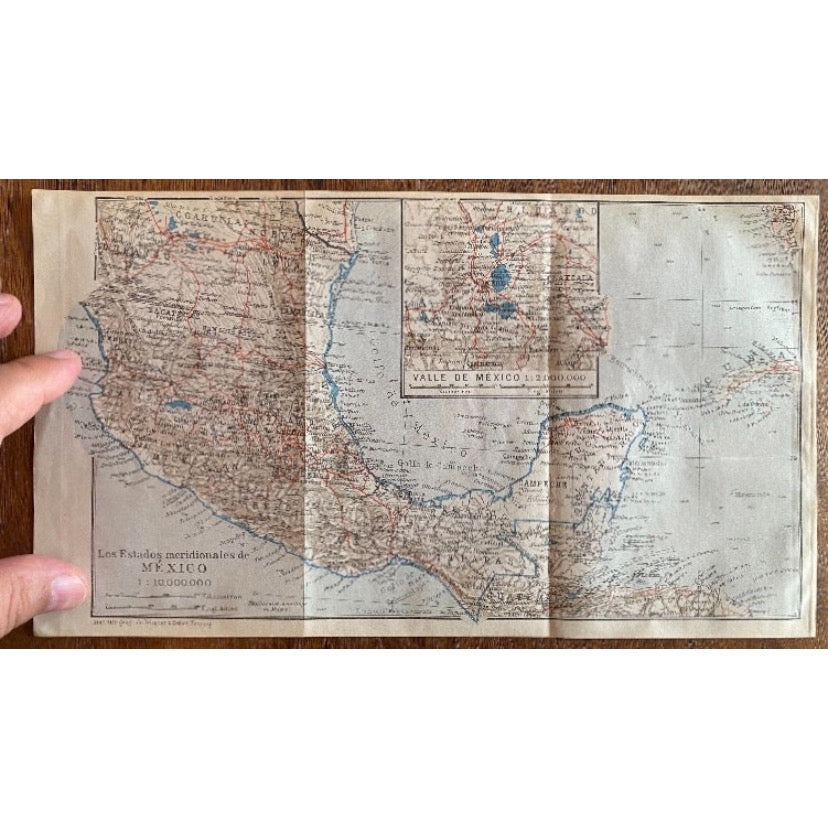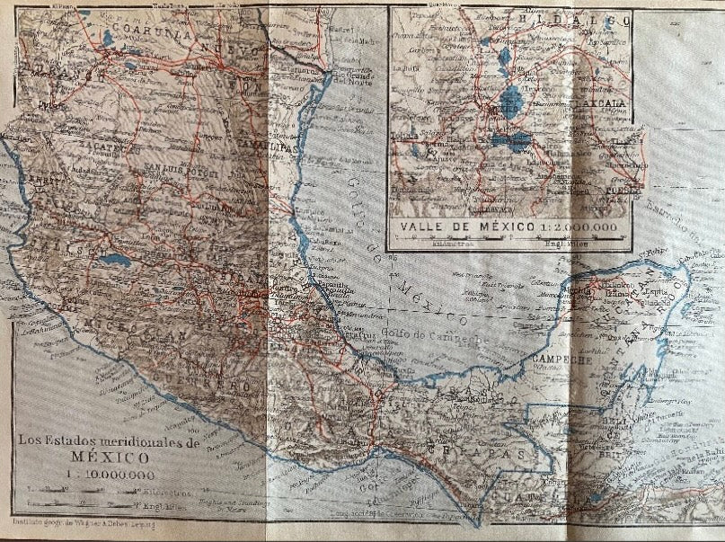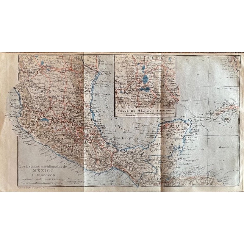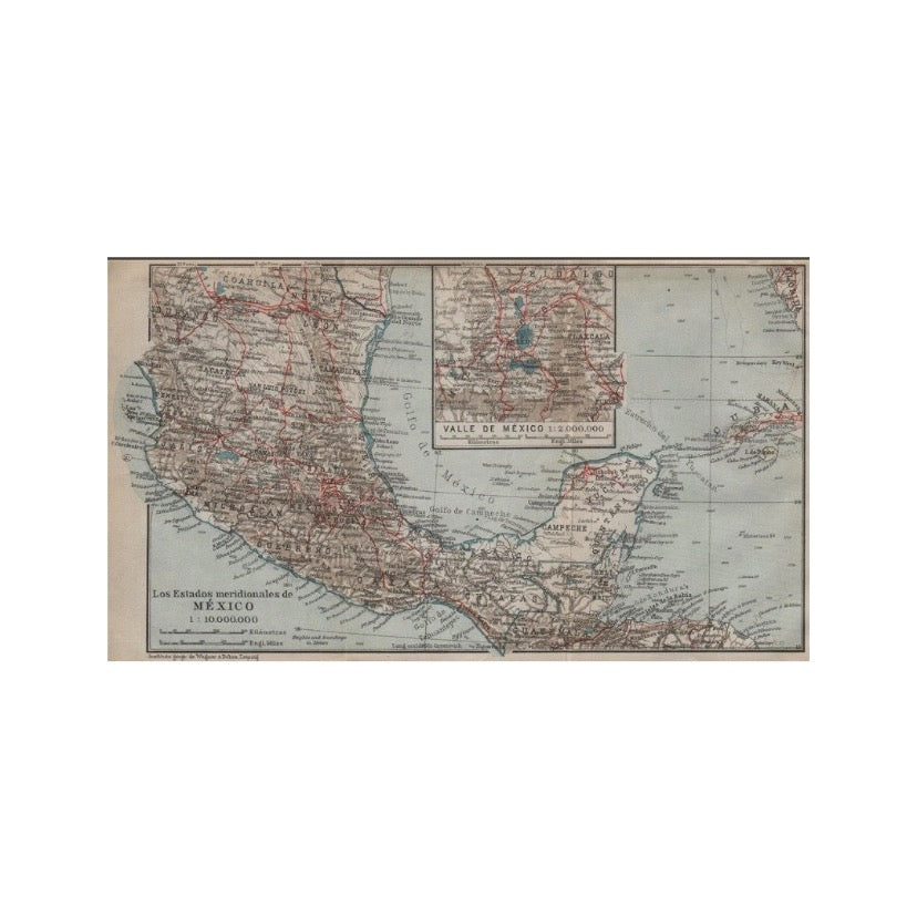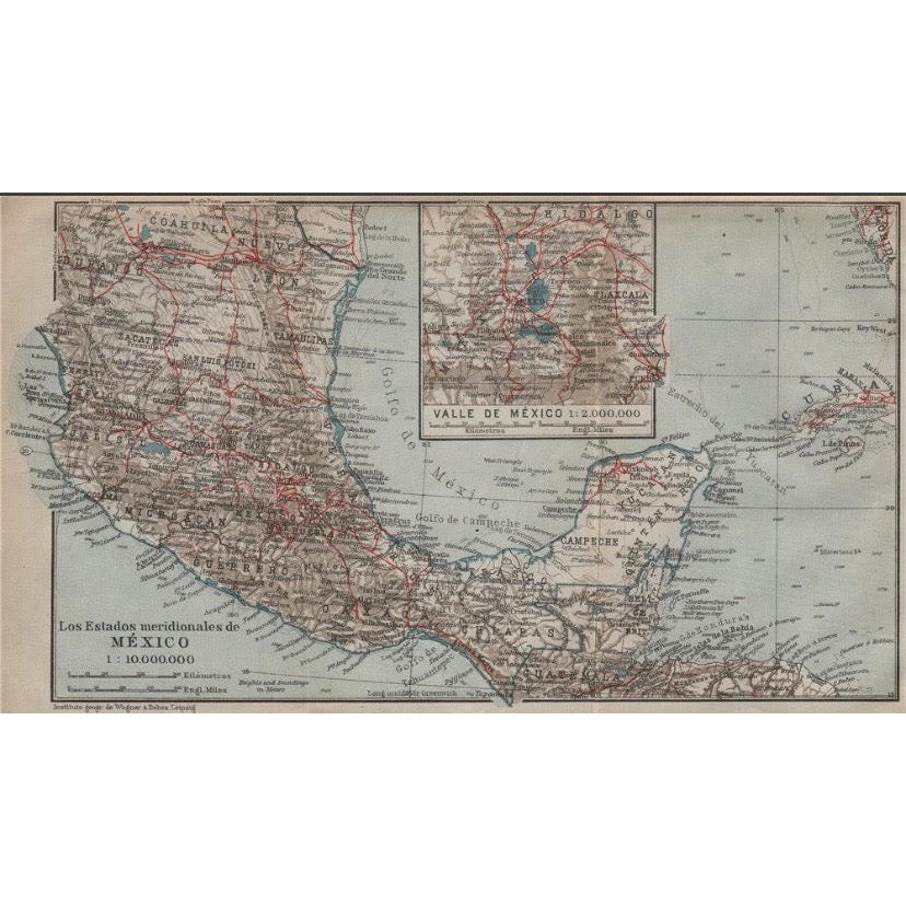 Beautiful and original Southern Mexico map. ESTADOS MERIDIONALES DE MÉXICO. Valle de Mexico mapa 1909. Antique colour map; Scale 1:10.000.000; Scale 1:2.000.000;