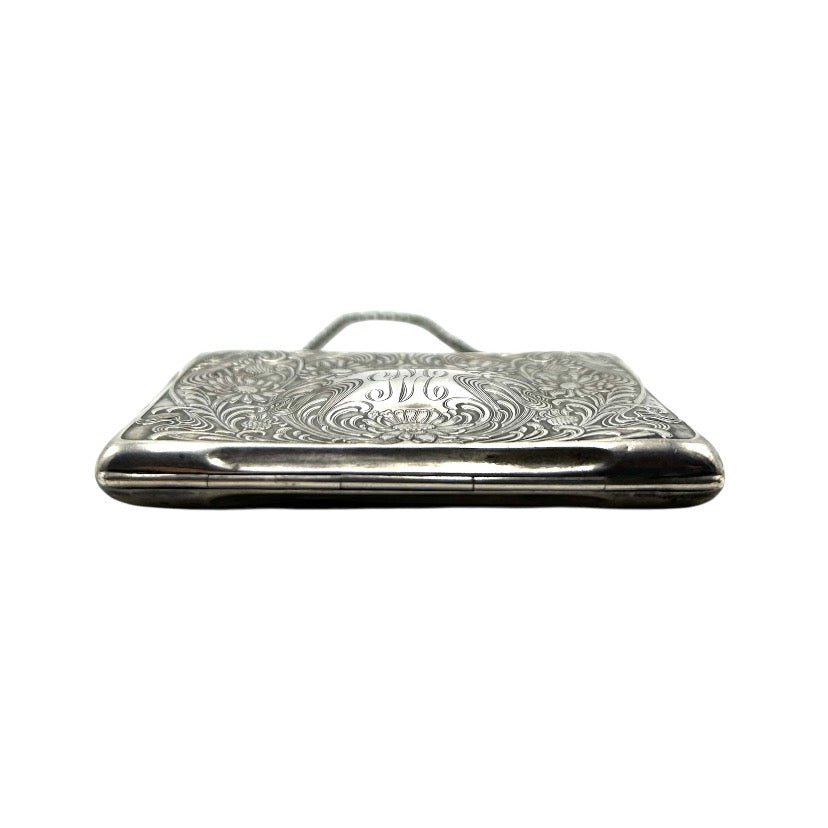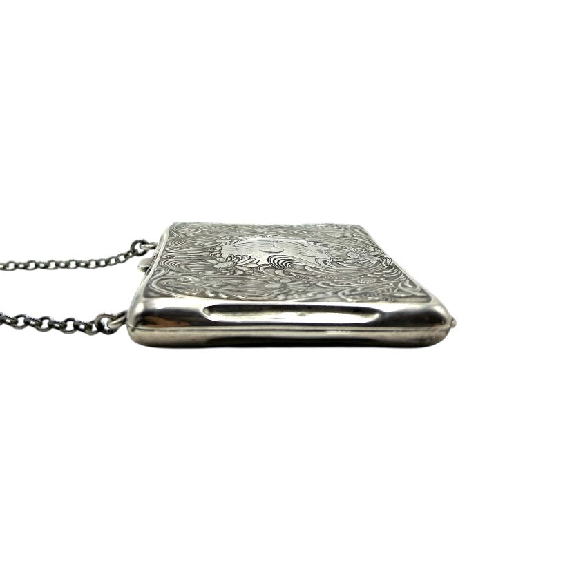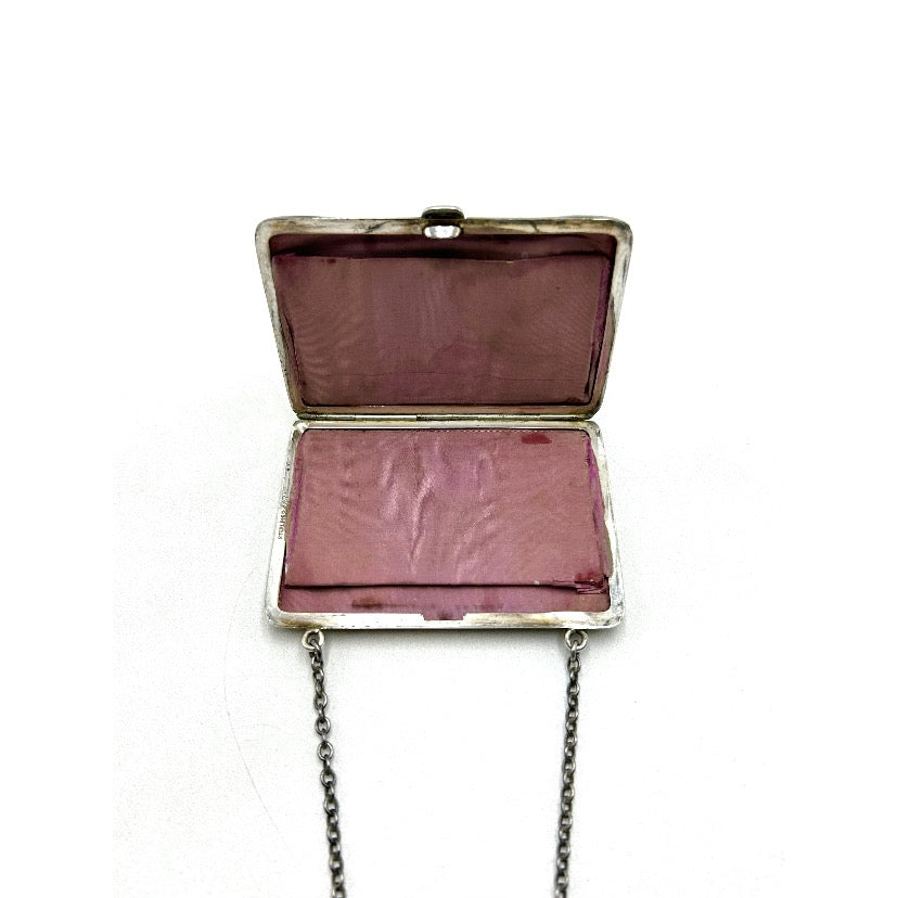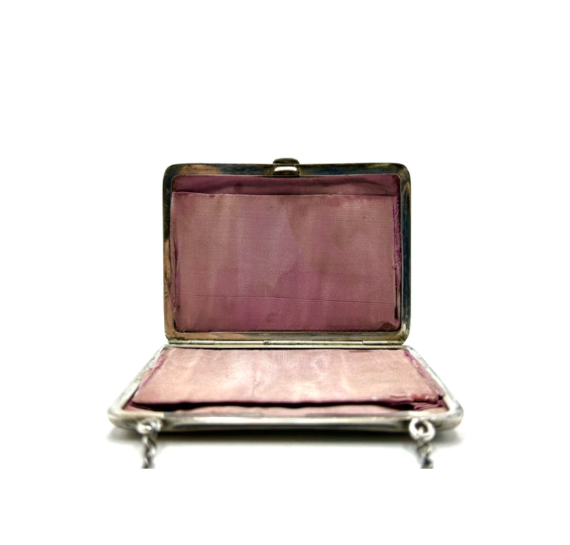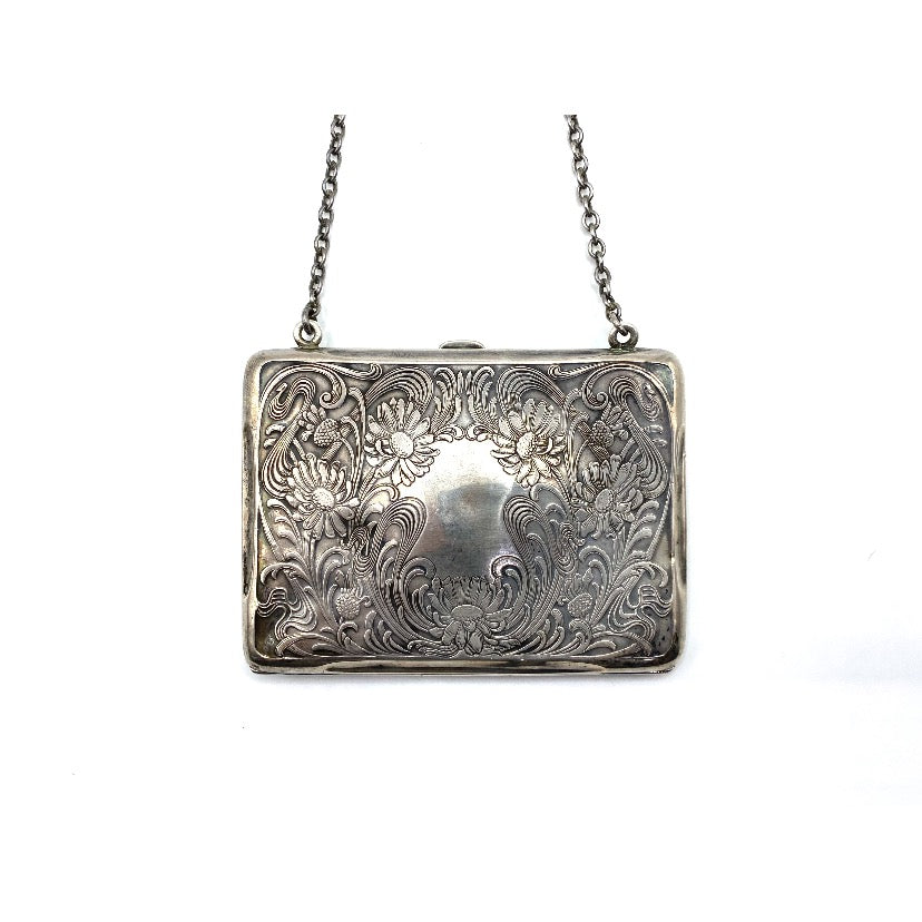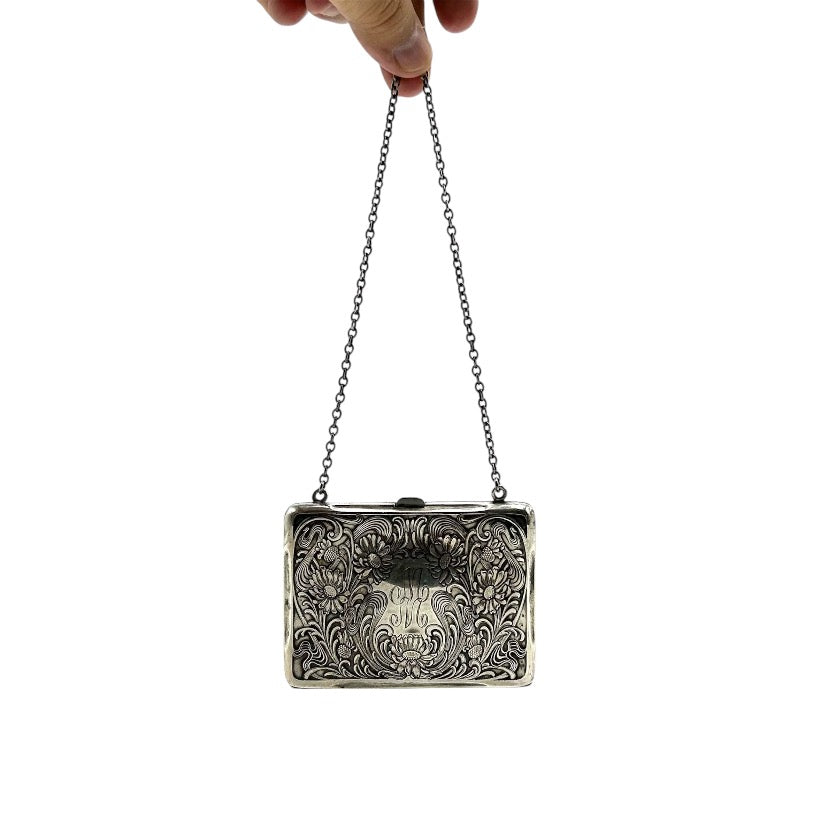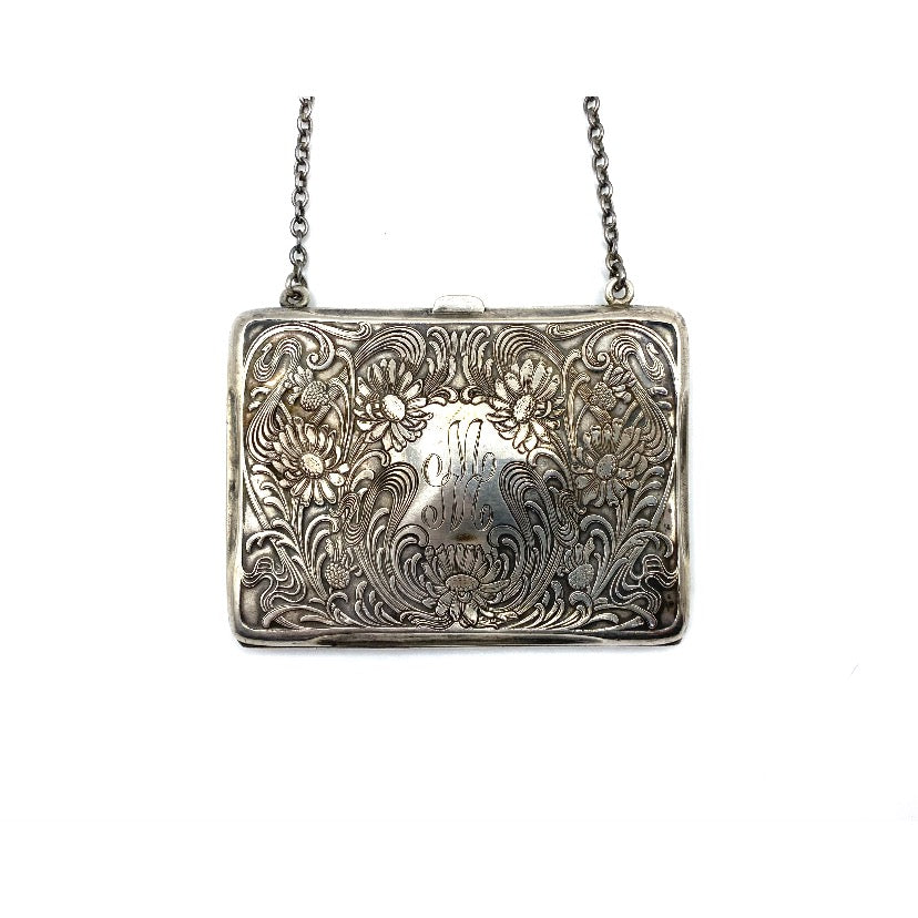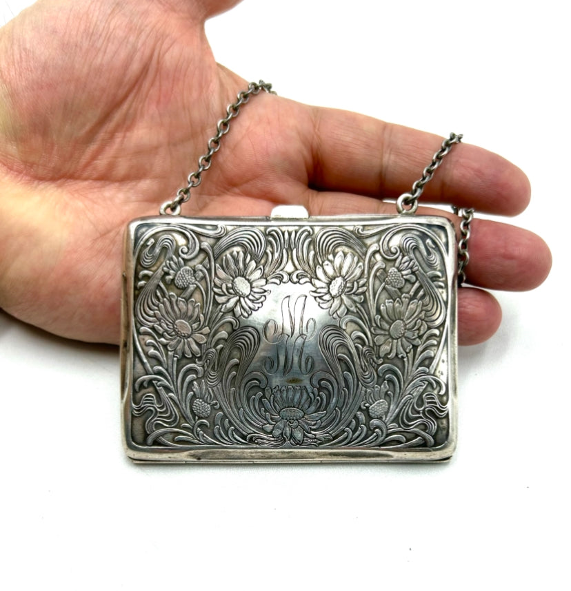 Beautiful Antique Tiffany, art nouveau, Sterling silver, square change pouch with engraved floral design and monogrammed MM. Inside is lined in pink silk. Carrying chain.