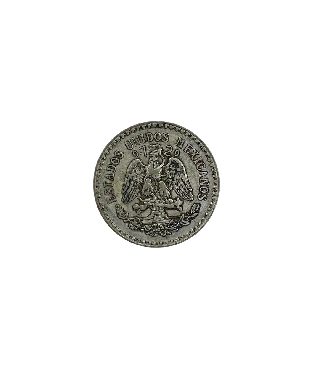 The Mexican coat of arms: a Mexican golden eagle perched on a prickly pear cactus devouring a rattlesnake. The eagle, cactus and snake are surrounded by a holm oak (encina) branch on one side and a laurel branch on the other. The head of the eagle and snake separates the purity (0.720). “ESTADOS UNIDOS MEXICANOS” over the coat of arms.