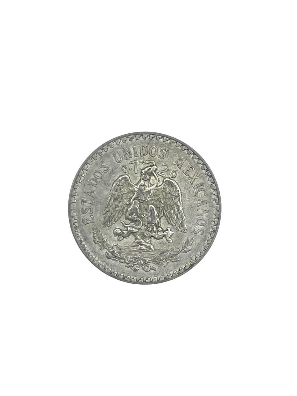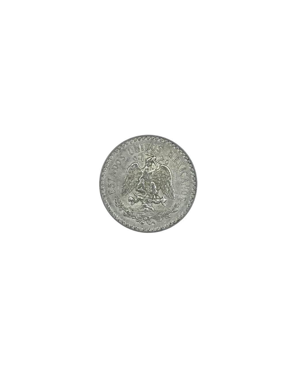 The Mexican coat of arms: a Mexican golden eagle perched on a prickly pear cactus devouring a rattlesnake. The eagle, cactus and snake are surrounded by a holm oak (encina) branch on one side and a laurel branch on the other. The head of the eagle and snake separates the purity (0.720). “ESTADOS UNIDOS MEXICANOS” over the coat of arms.