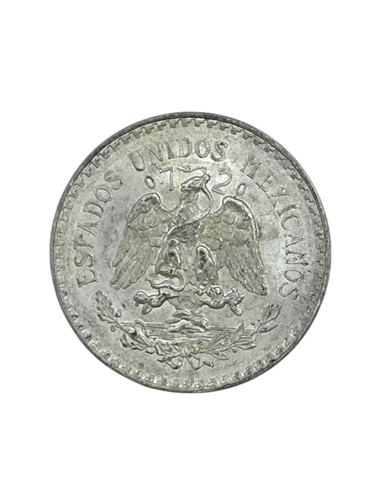 The Mexican coat of arms: a Mexican golden eagle perched on a prickly pear cactus devouring a rattlesnake. The eagle, cactus and snake are surrounded by a holm oak (encina) branch on one side and a laurel branch on the other. The head of the eagle and snake separates the purity (0.720). “ESTADOS UNIDOS MEXICANOS” over the coat of arms.
