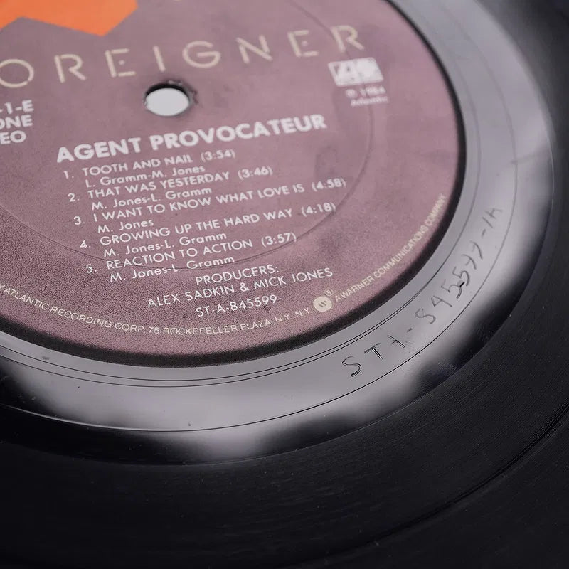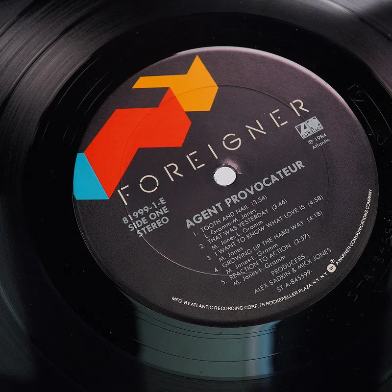 Foreigner Agent Provocateur, original 1984 Atlantic Records pressing (81999-1-E), featuring the Columbia House edition. Includes the chart-topping ballad "I Want to Know What Love Is" along with tracks like "That Was Yesterday" and "Reaction to Action." Bold geometric album art on cover and custom-printed label. Vinyl shows light play wear, visually VG+, with light edge wear to the jacket, overall VG.