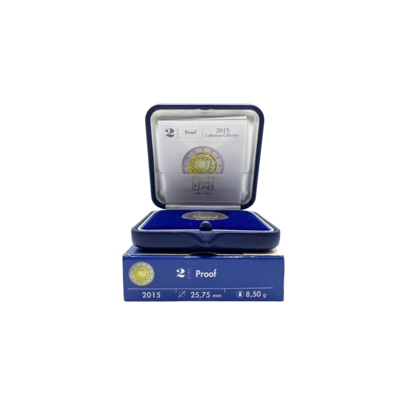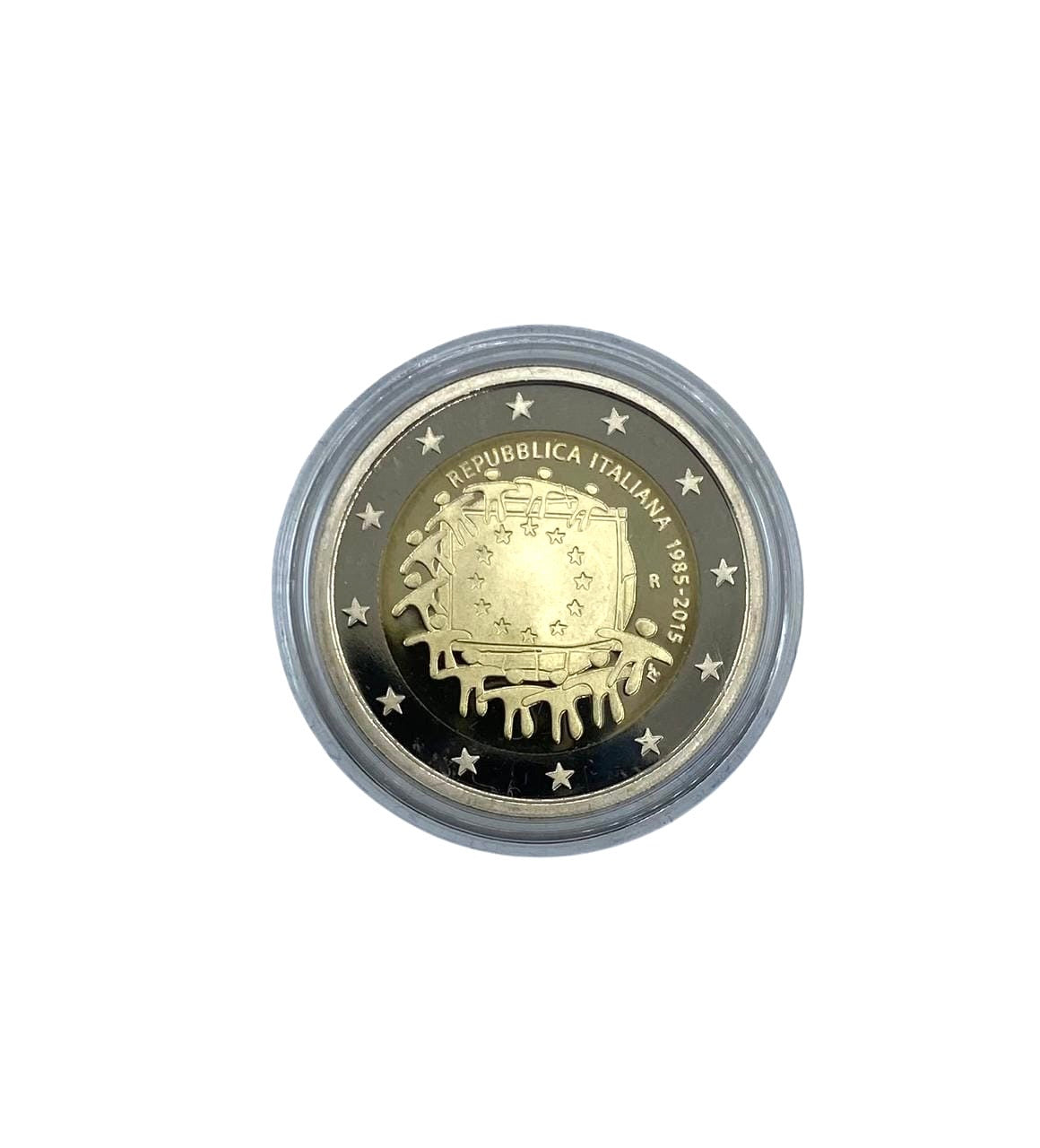 The EU flag is depicted in the center of the coin as a symbol of the union of peoples and cultures that share visions and ideals for a better common future. The twelve stars that turn into human figures represent the birth of a new Europe. The issuing country "REPUBBLICA ITALIANA" and the years "1985-2015" appear in a semicircle at the top right; on the right, between the flag and the years, is the mint mark "R". Bottom right the initials of the author Georgios Stamatopoulos. On the outer edge 12 five-pointed stars representing the European Union.