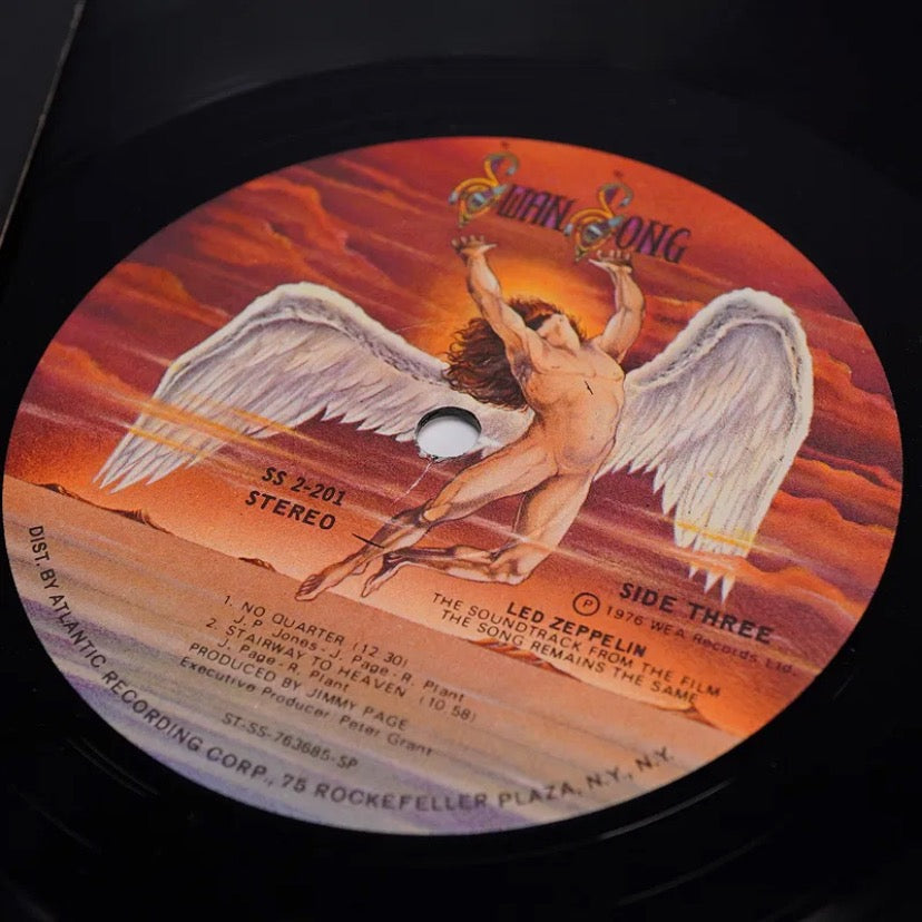 Original 1976 2LP soundtrack for the Led Zeppelin concert film The Song Remains the Same, released by Swan Song Records (SS 2-201). This gatefold set includes both vinyl records and a multi-page color booklet insert with film stills and live performance photography. Tracks include iconic live versions of "Rock and Roll," "Celebration Day," "Dazed and Confused," "Stairway to Heaven," and "Whole Lotta Love." Both records feature the Swan Song "angel" label design. Produced by Jimmy Page and distributed by Atlantic Recording Corporation.
