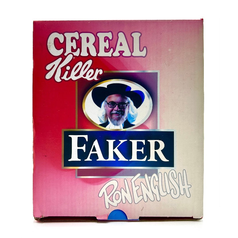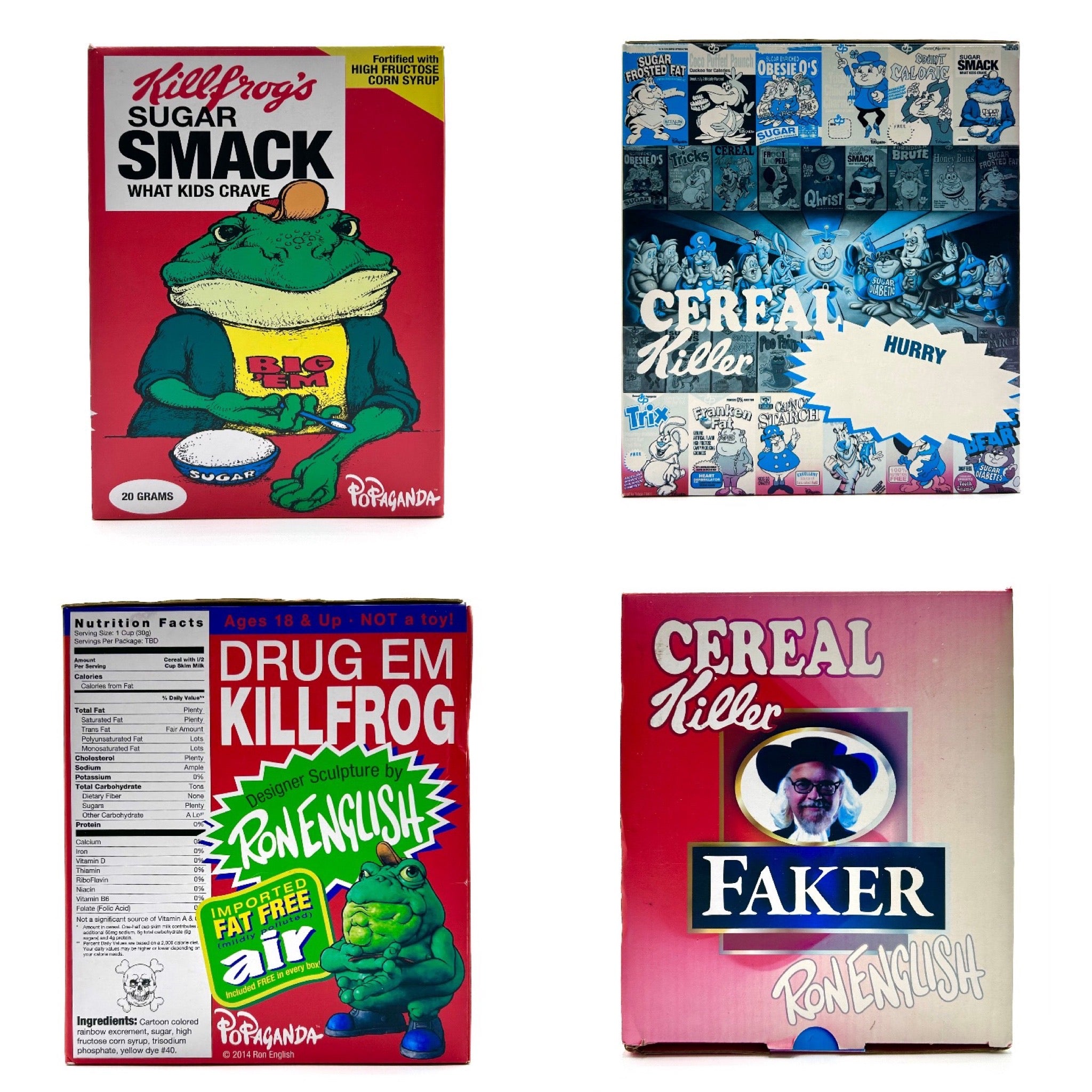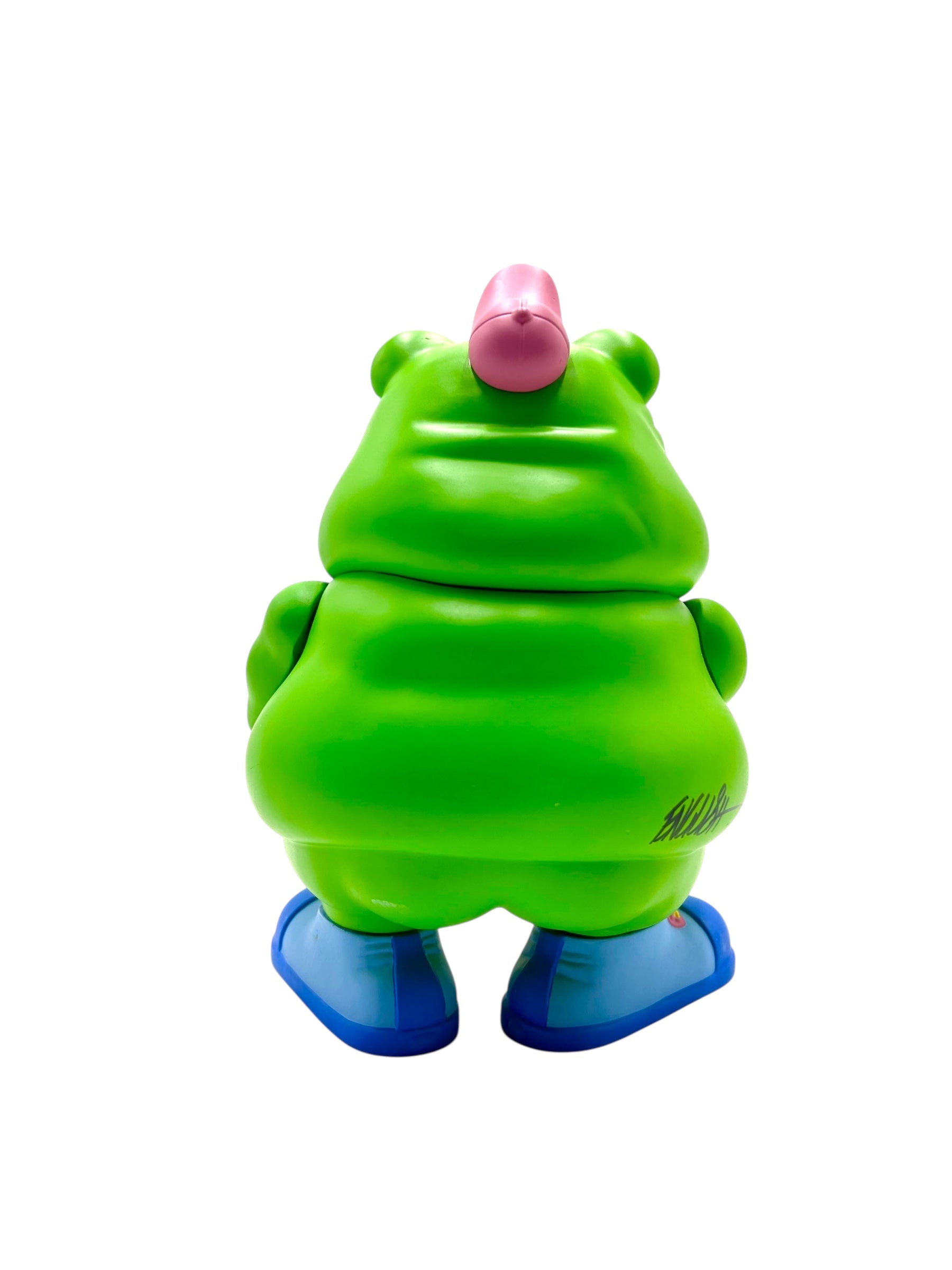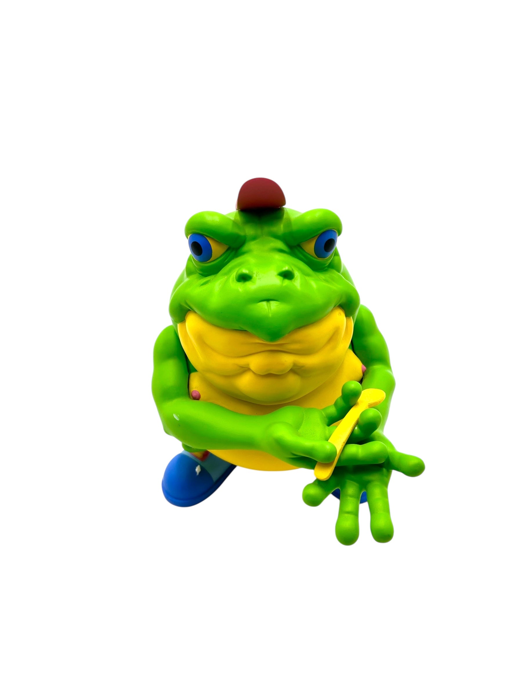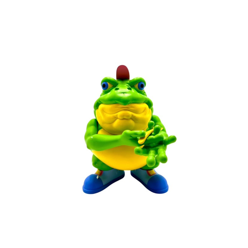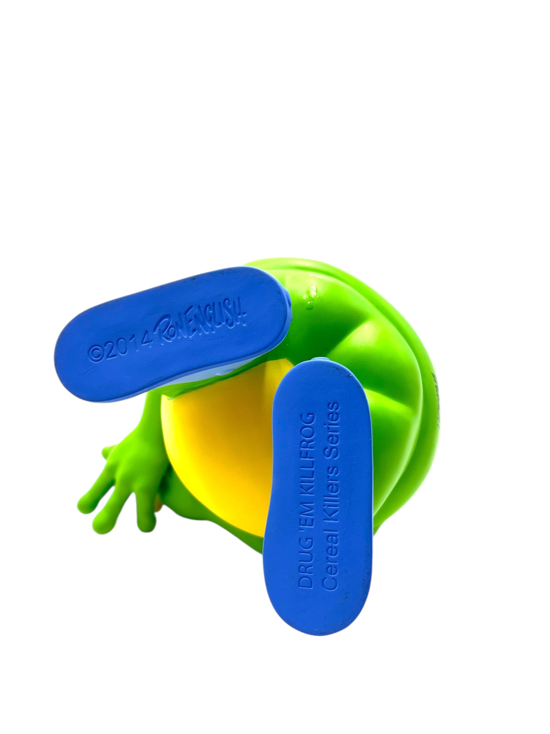 A vibrant green and yellow bullfrog holding a spoon, parodying a mascot for a breakfast cereal. Part of the Cereal Killers Series designed by Ron English. Signed with black marker on the back. Title, year and artist impression on the bottom. Figure dimensions: 5.5"L x 7.5"W x 8"H. Box dimensions: 7"L x 8.25"W x 9.5"H.