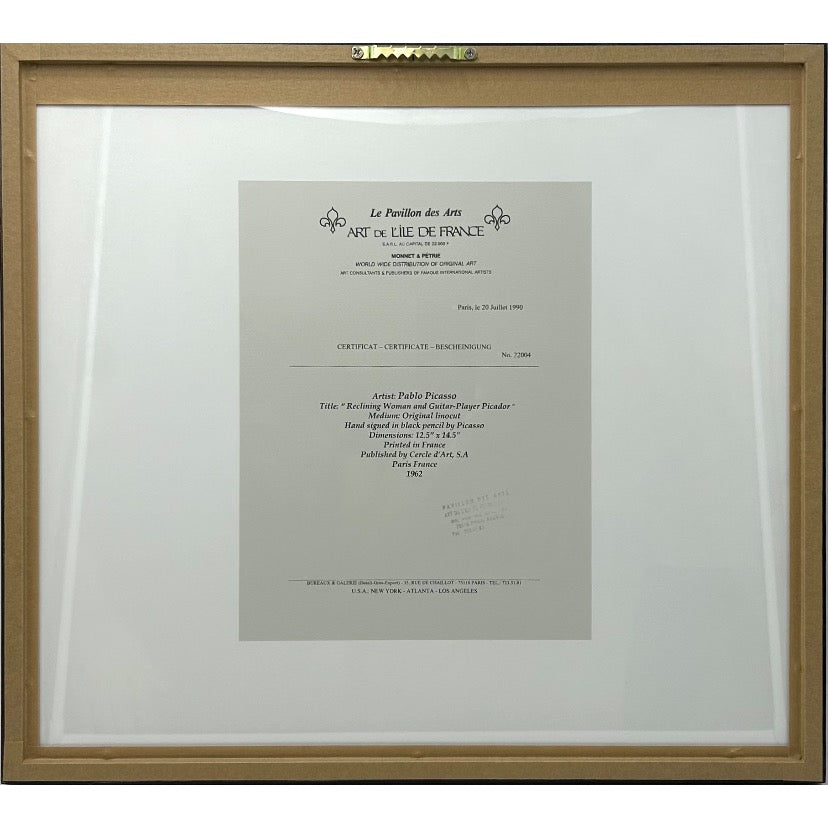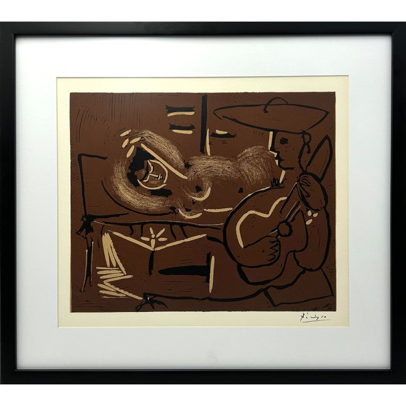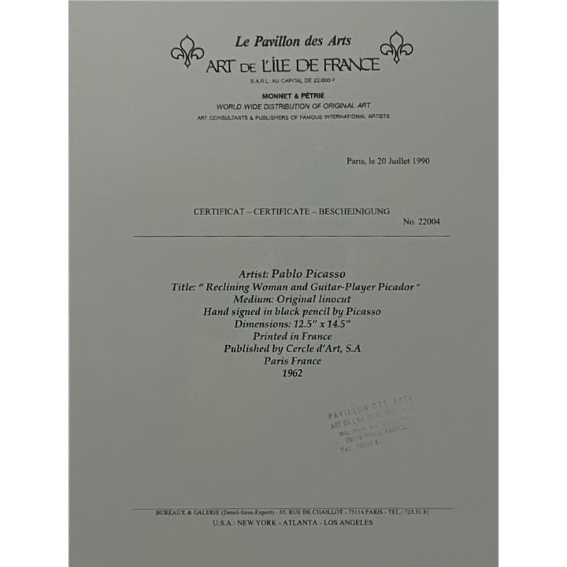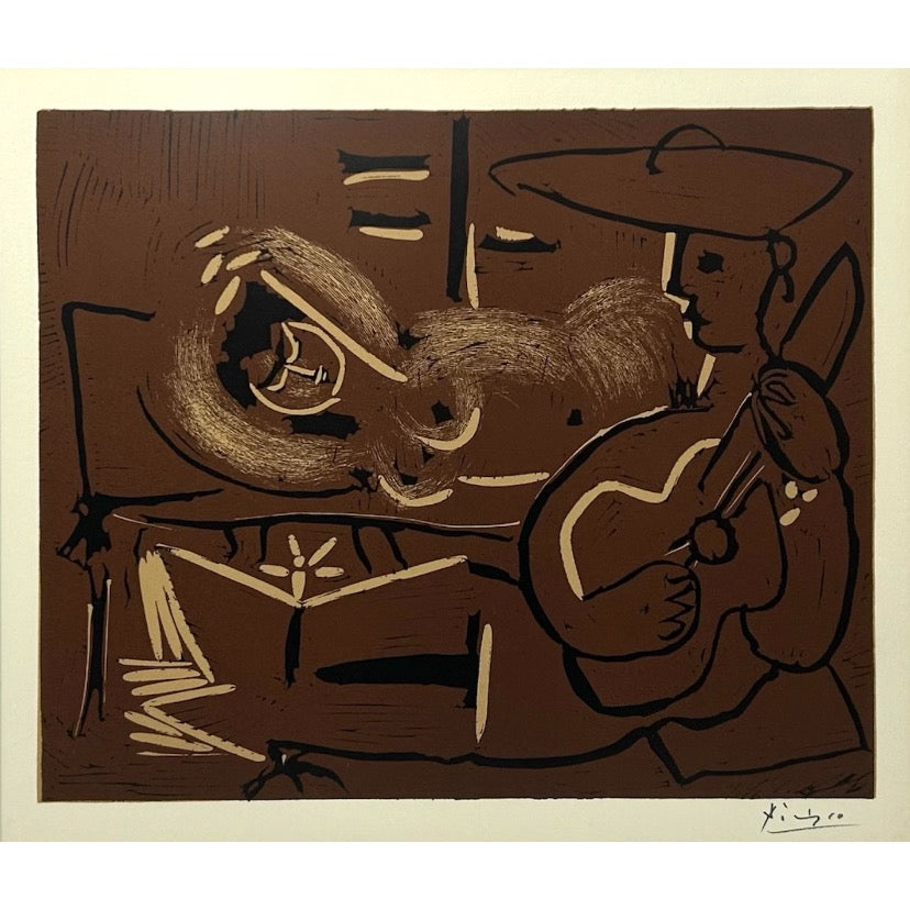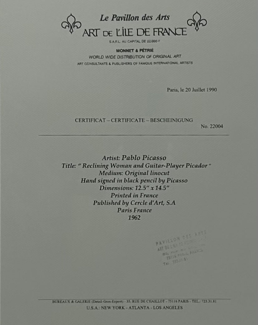 Pablo Picasso , Original linocut “ Reclining woman and guitar player picador“ 1962 , Printed en France by Cercle D’Art .