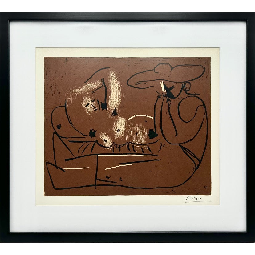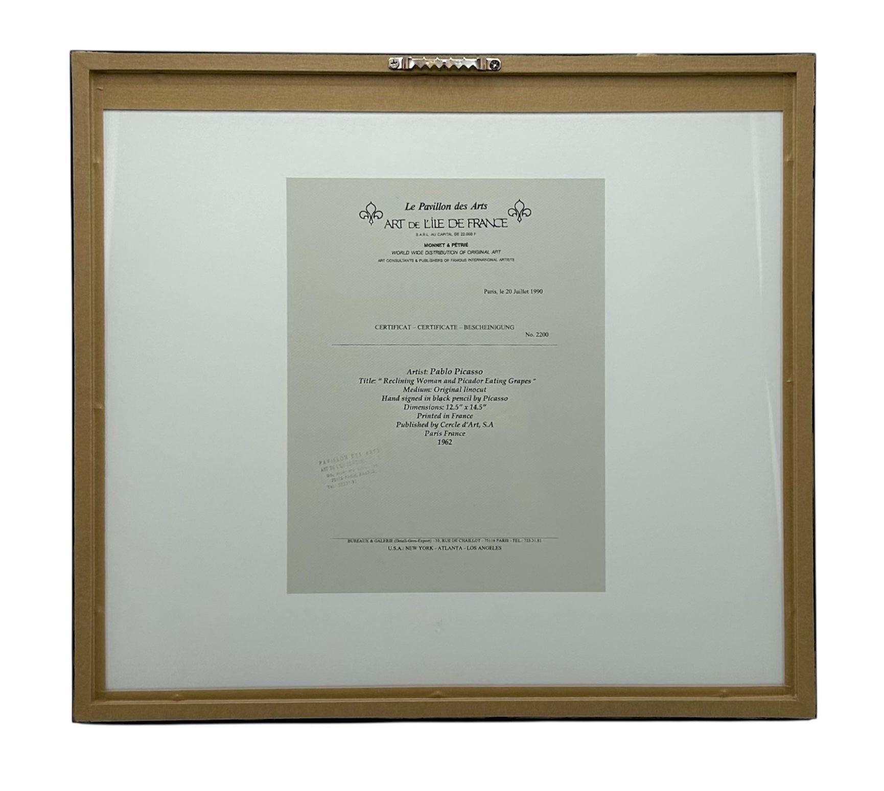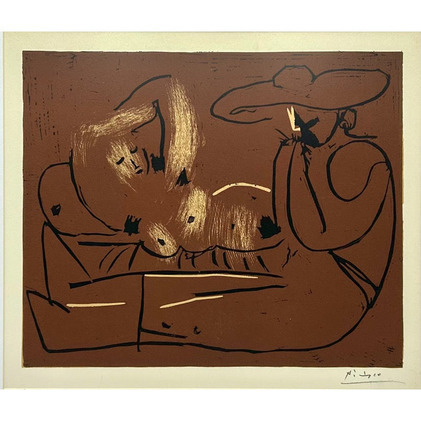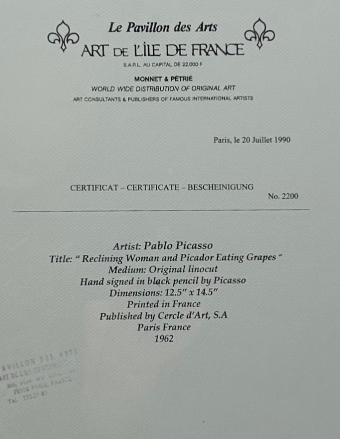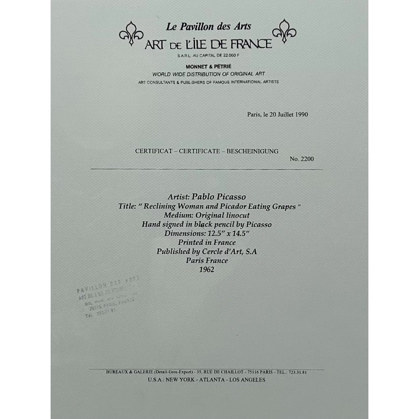 Pablo Picasso , Original linocut “ Reclining Woman and Picador Eating Grapes“ 1962 , Printed en France by Cercle D’Art .