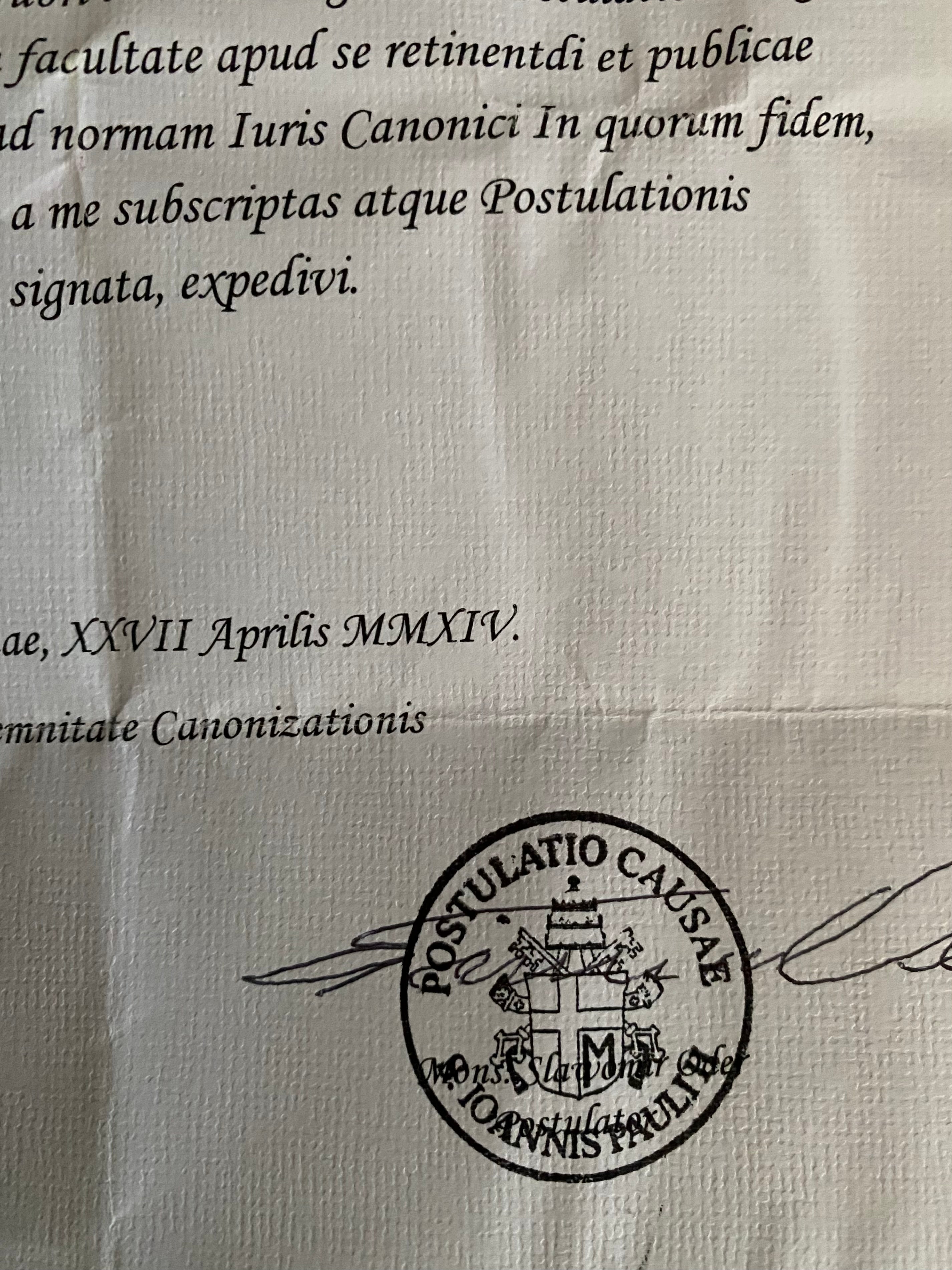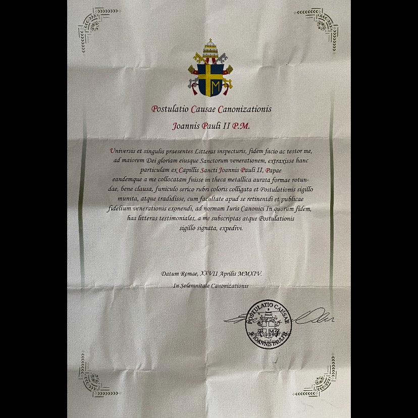 The relic is accompanied by an original matching authentic document issued in 27 April 2014 and signed by Rev. Slawomir Oder.