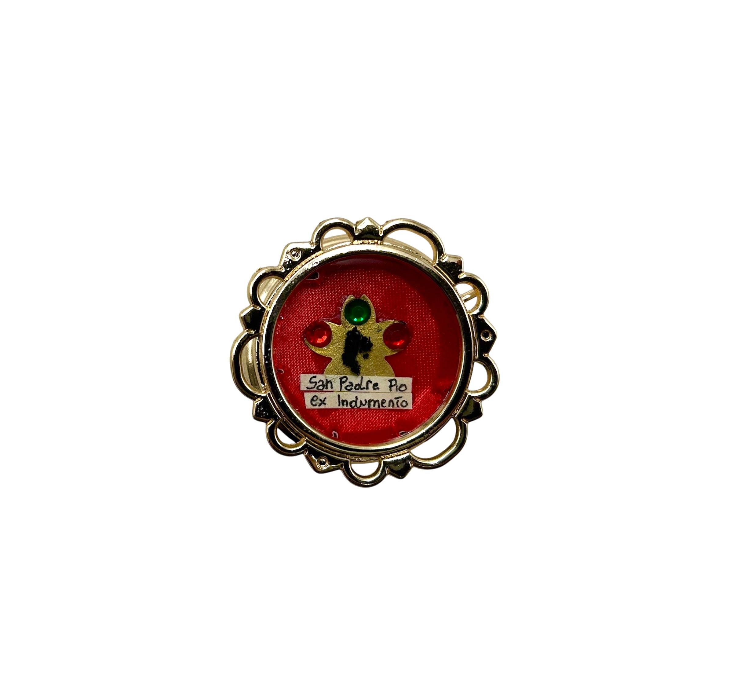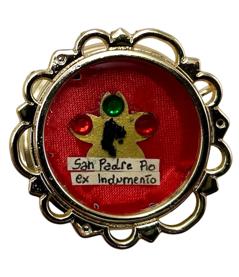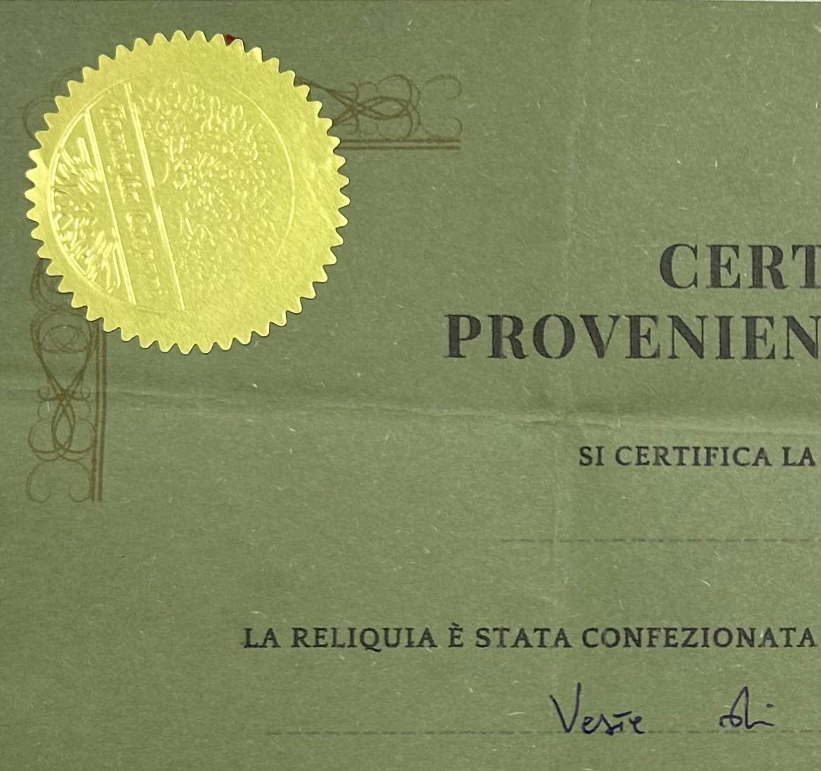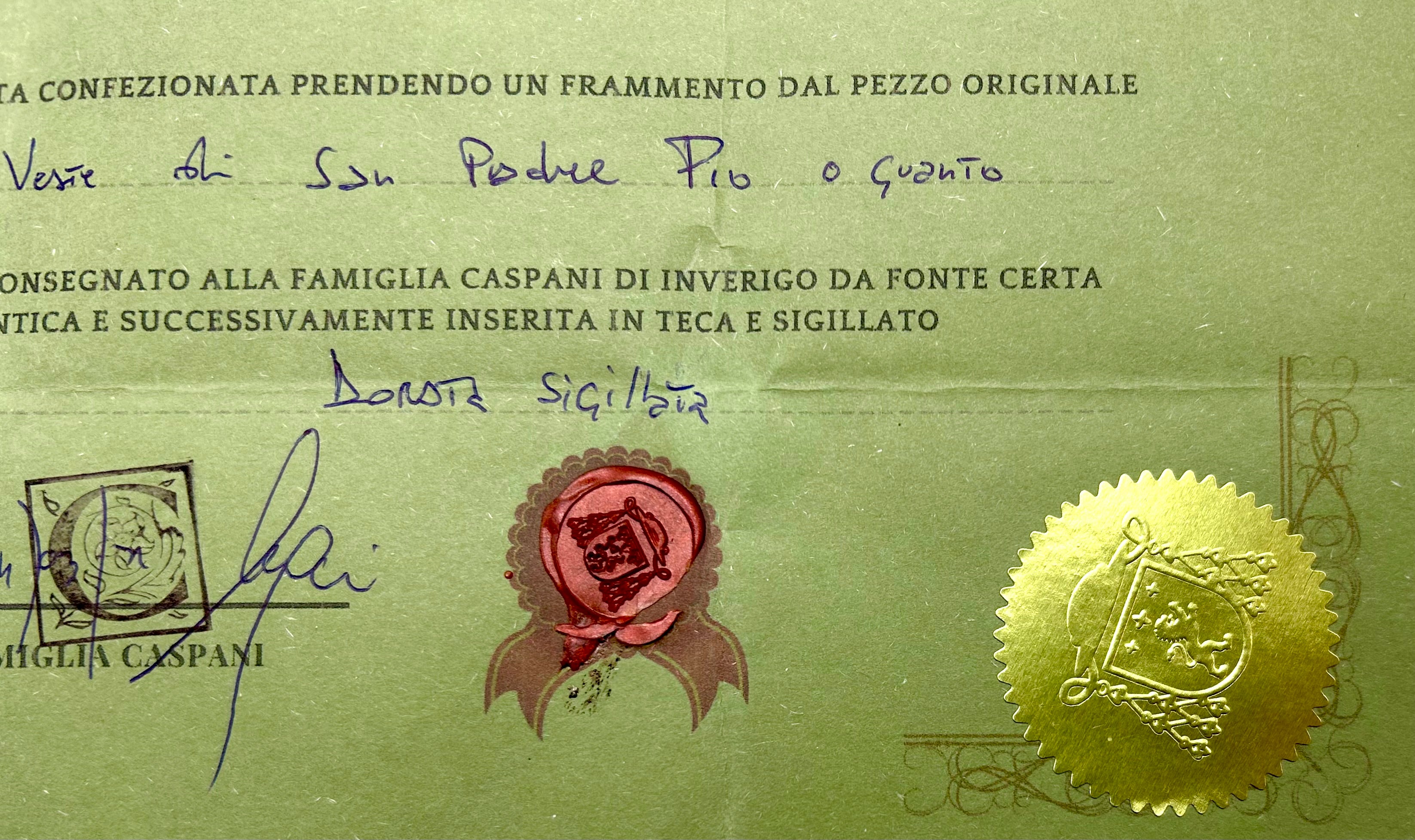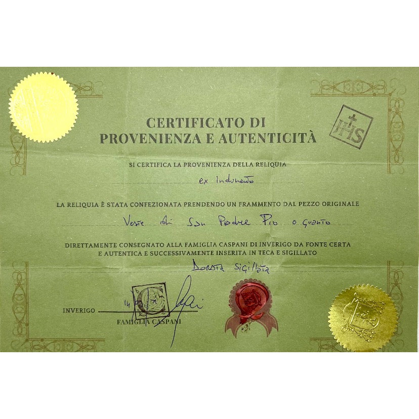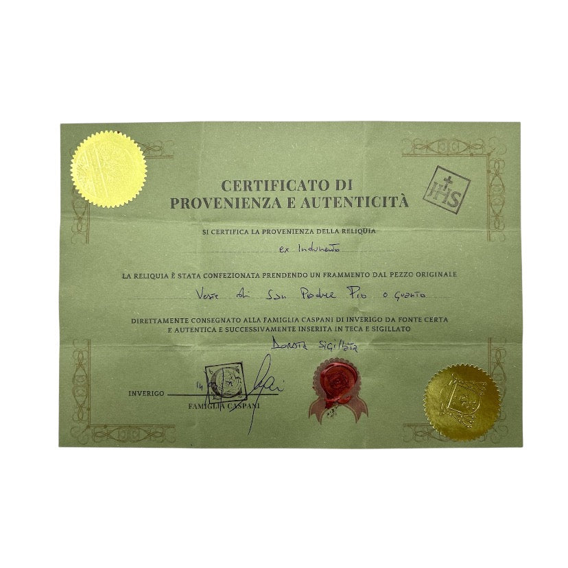 Reliquary containing a fragment of the scarf that St. Padre Pio of Pietralcina used daily. Present together with a certificate issued by the Caspani family of Inverigo, Brescia, who have been organizing pilgrimages for over 50 years and who had a close relationship and friendship with the Holy Pio.