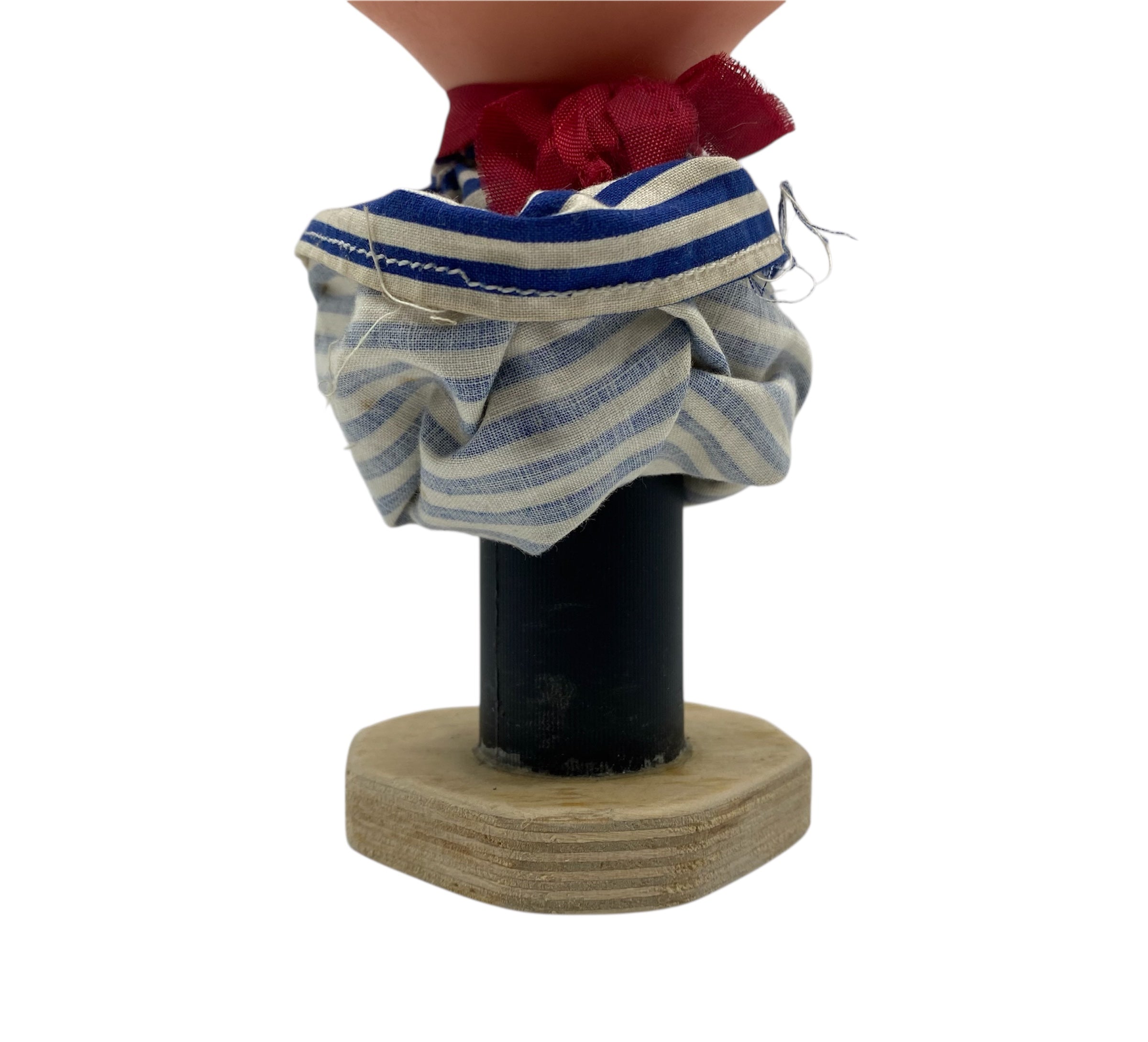He has a rubber head,  cotton t shirt and a wood base. Very rare , Hard to find.