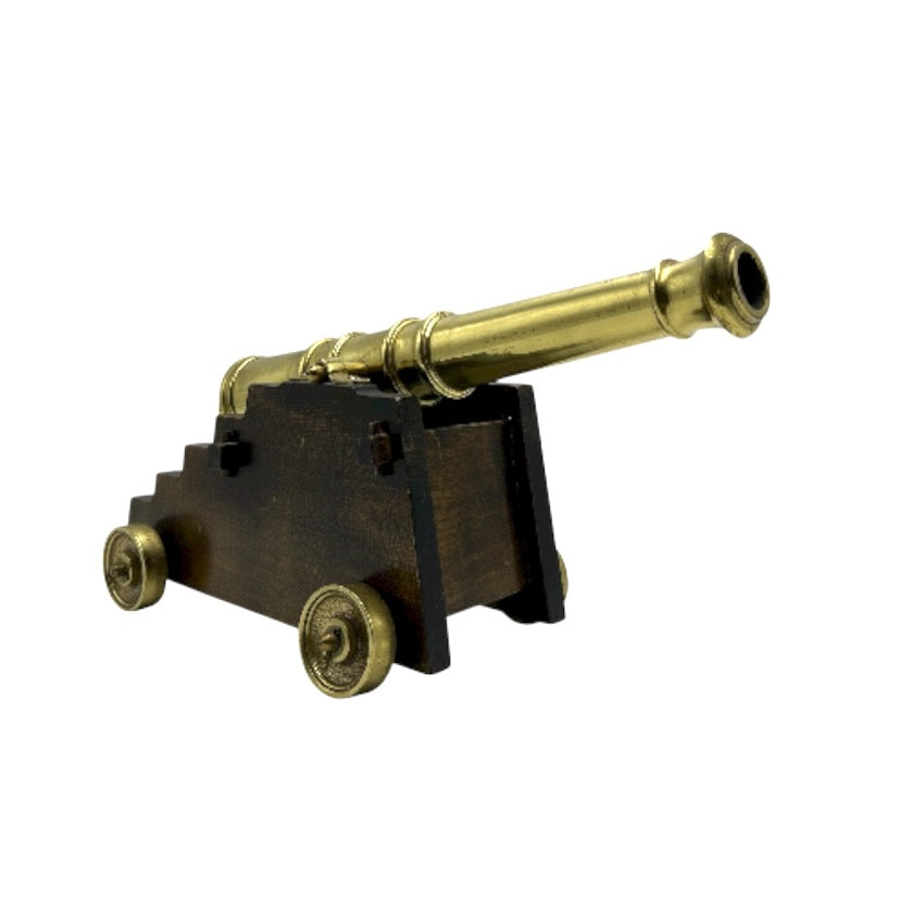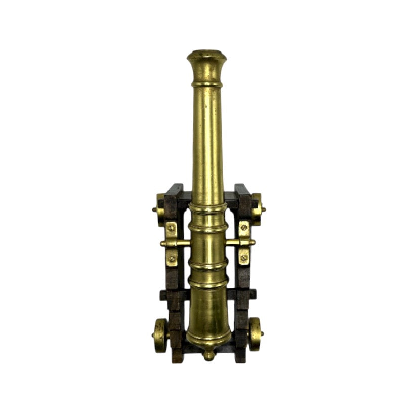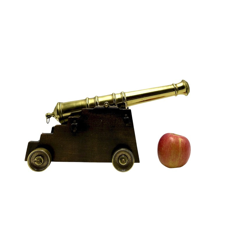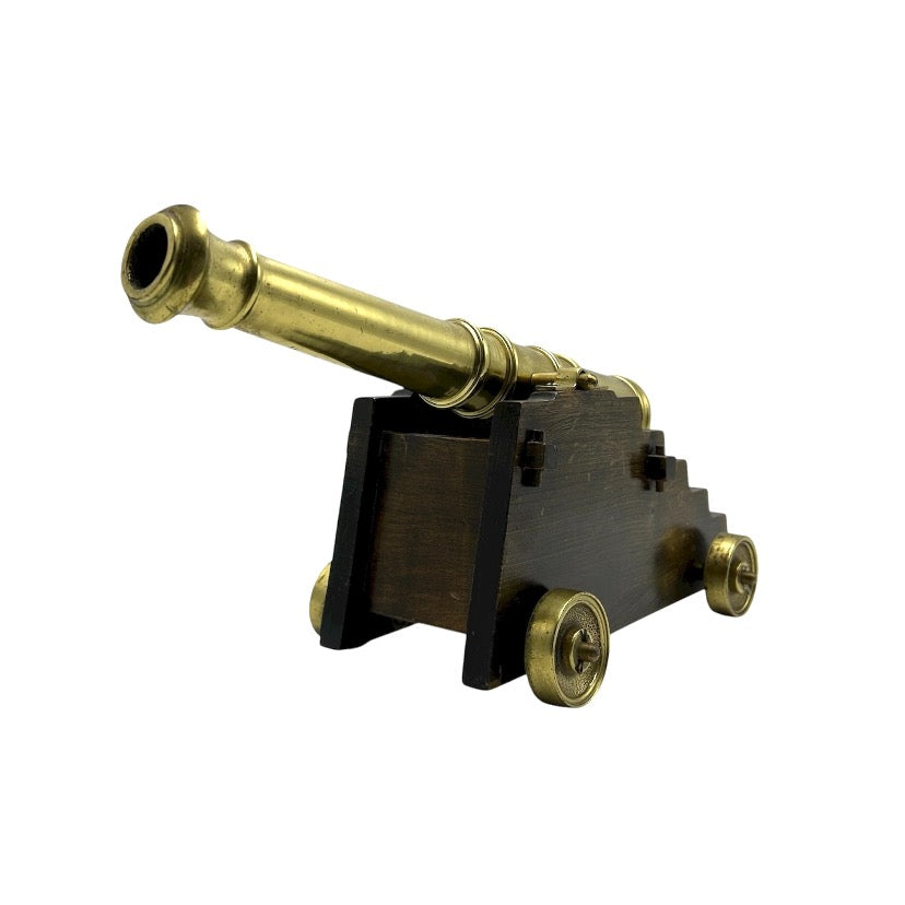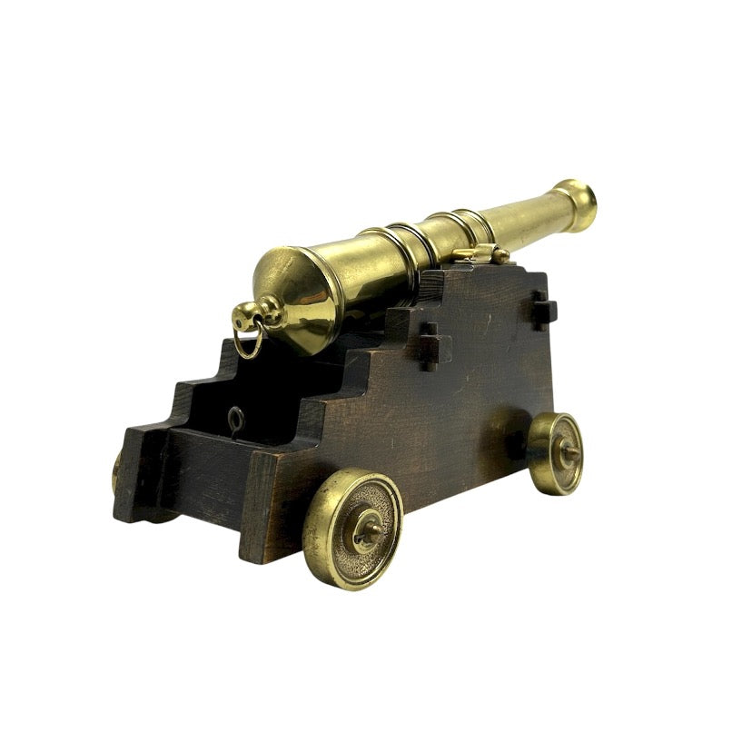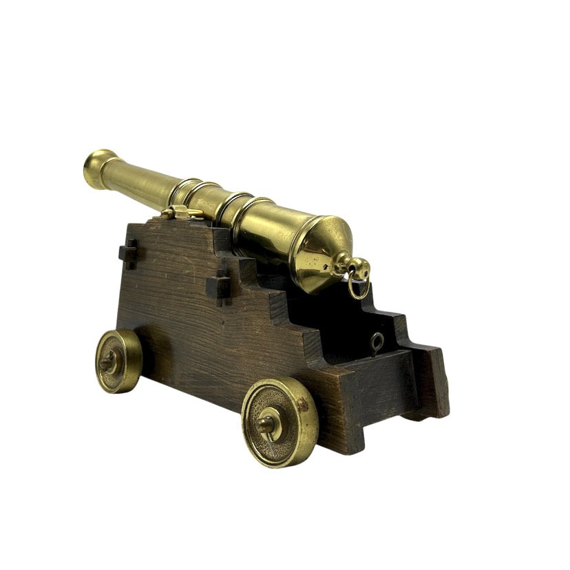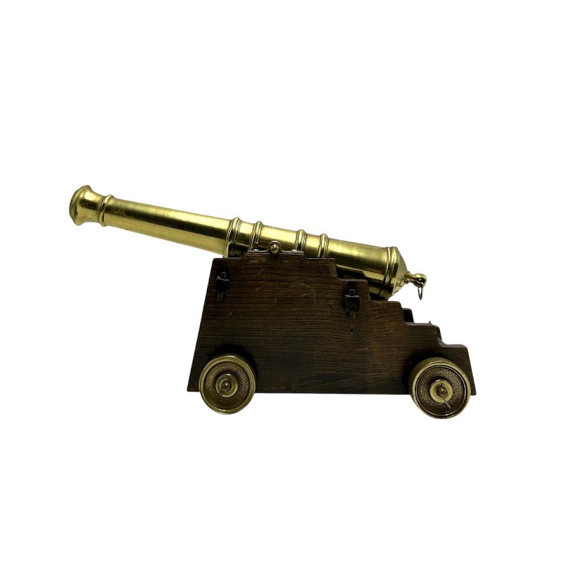 Vintage, mid 20th century, brass signal Cannon with wood base.