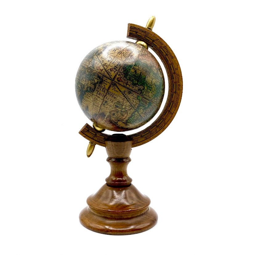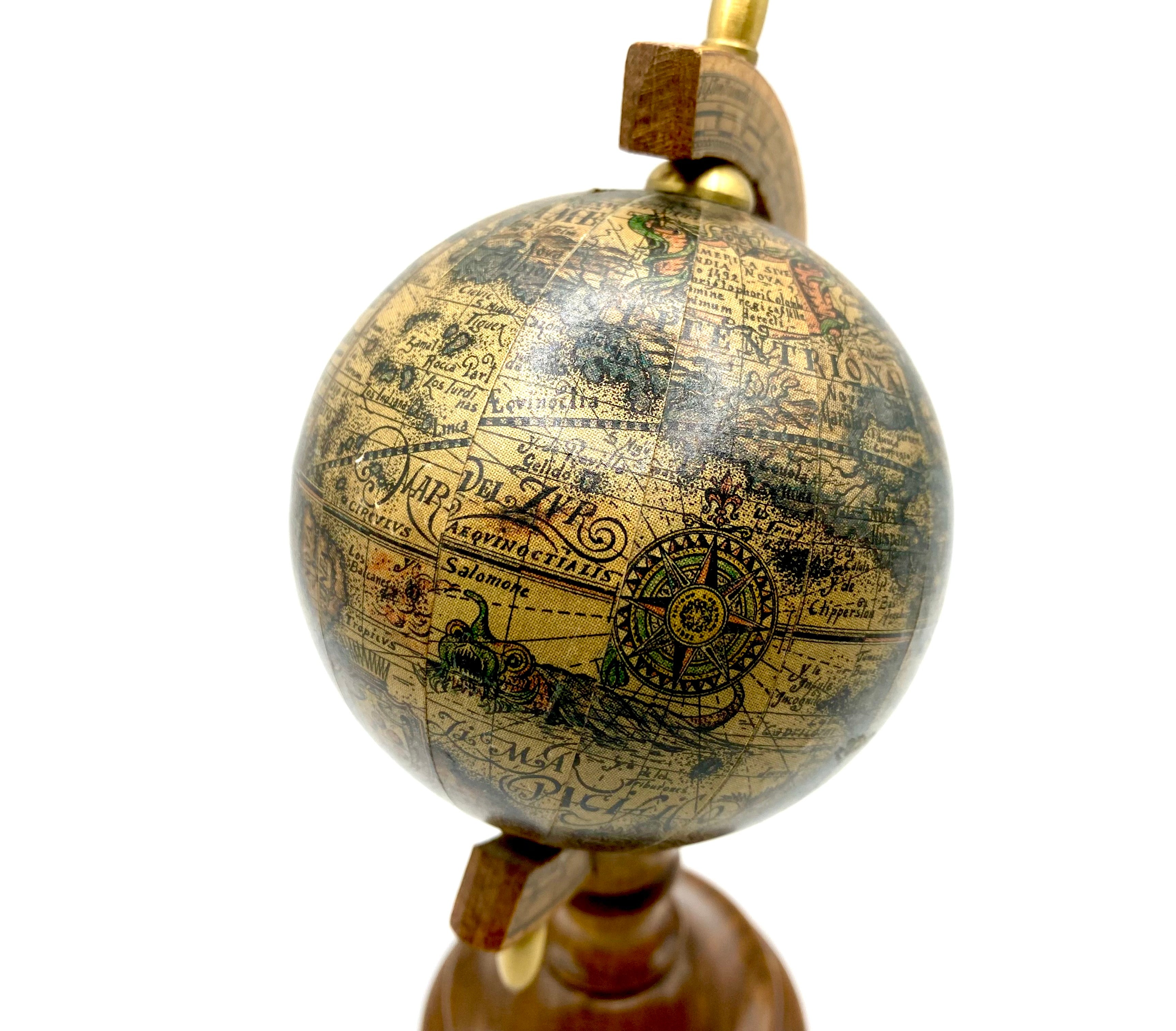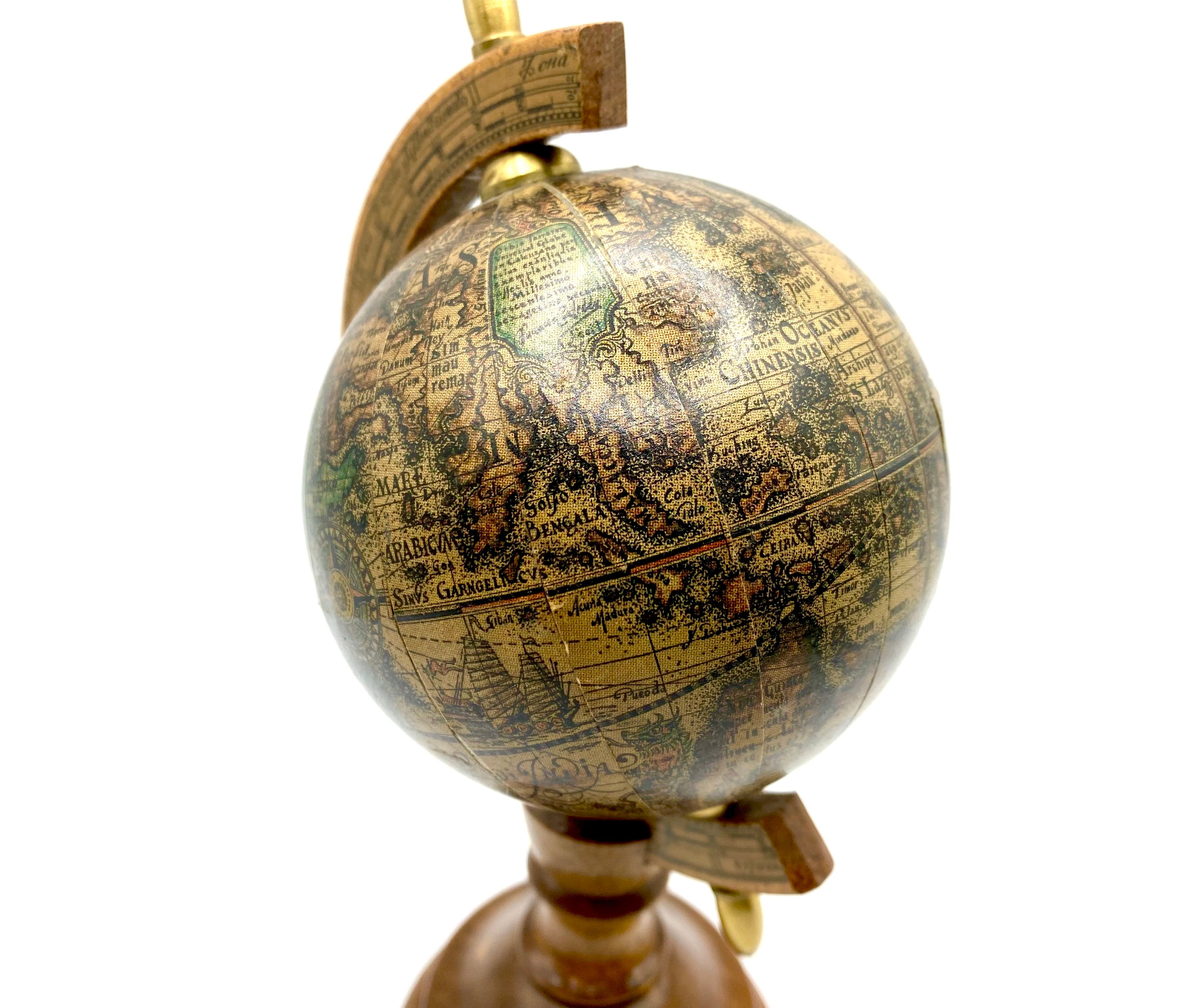 60s vintage globe on wood stand, renaissance style with armillary, crafted solid wood with a rich, antique finish.