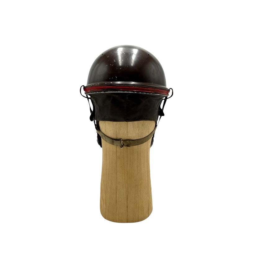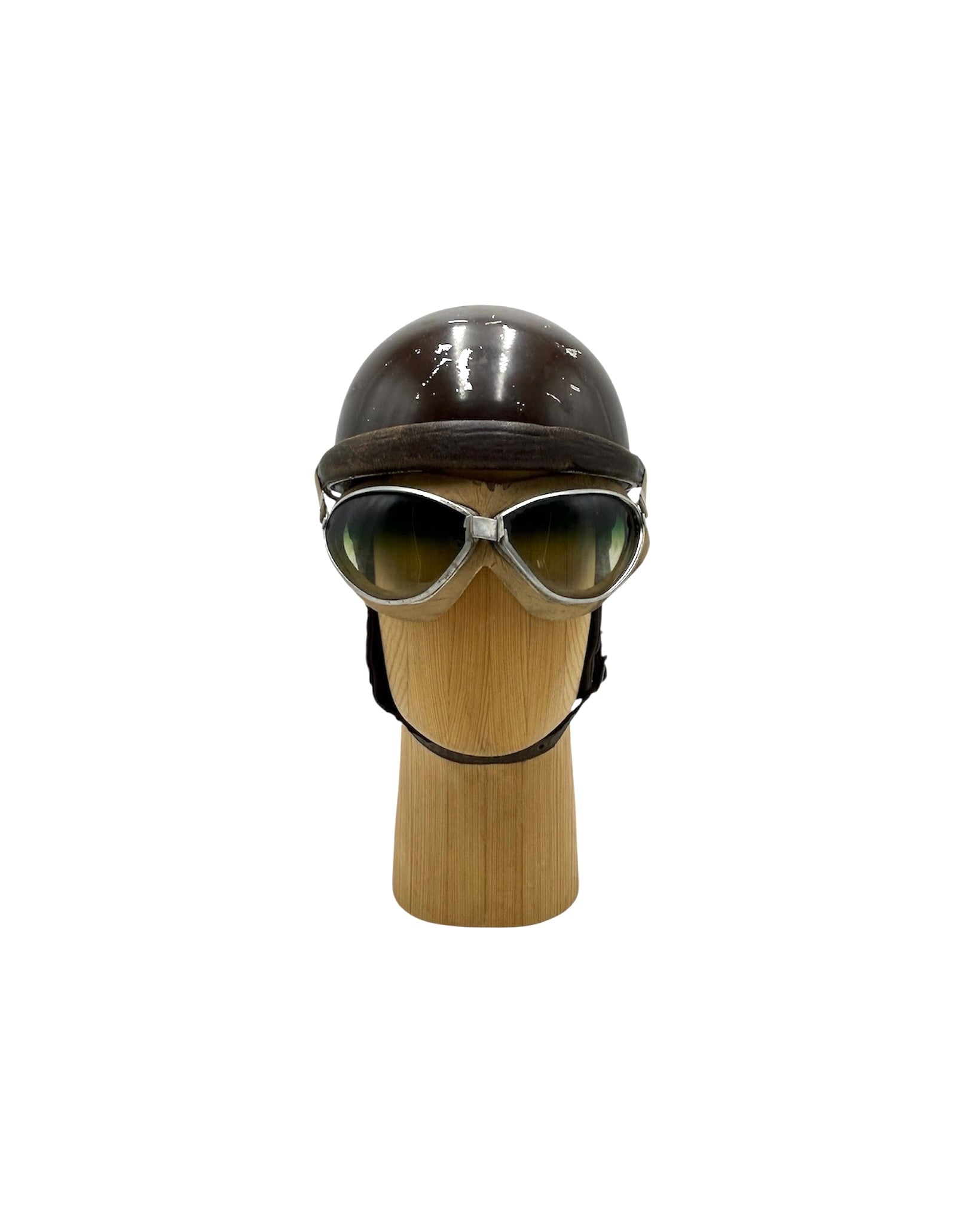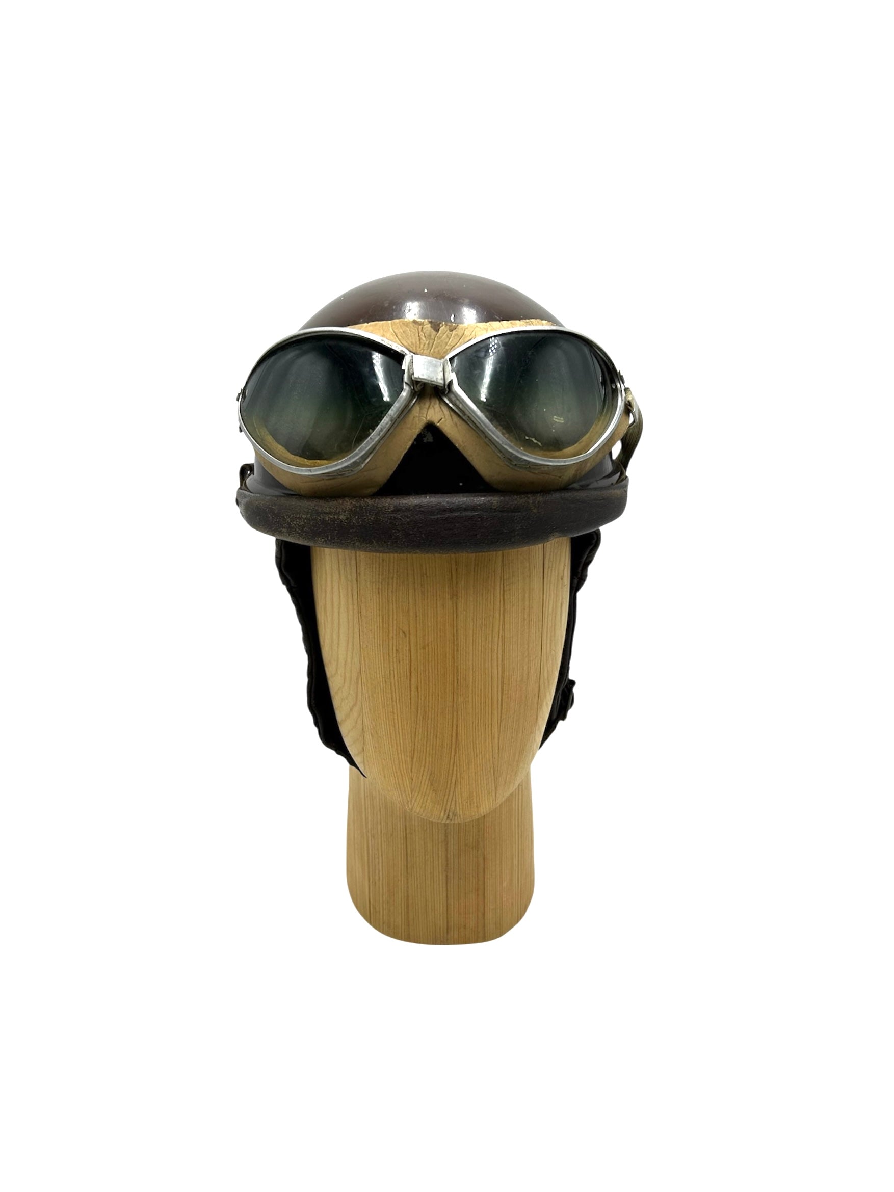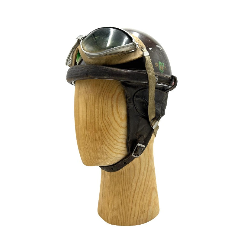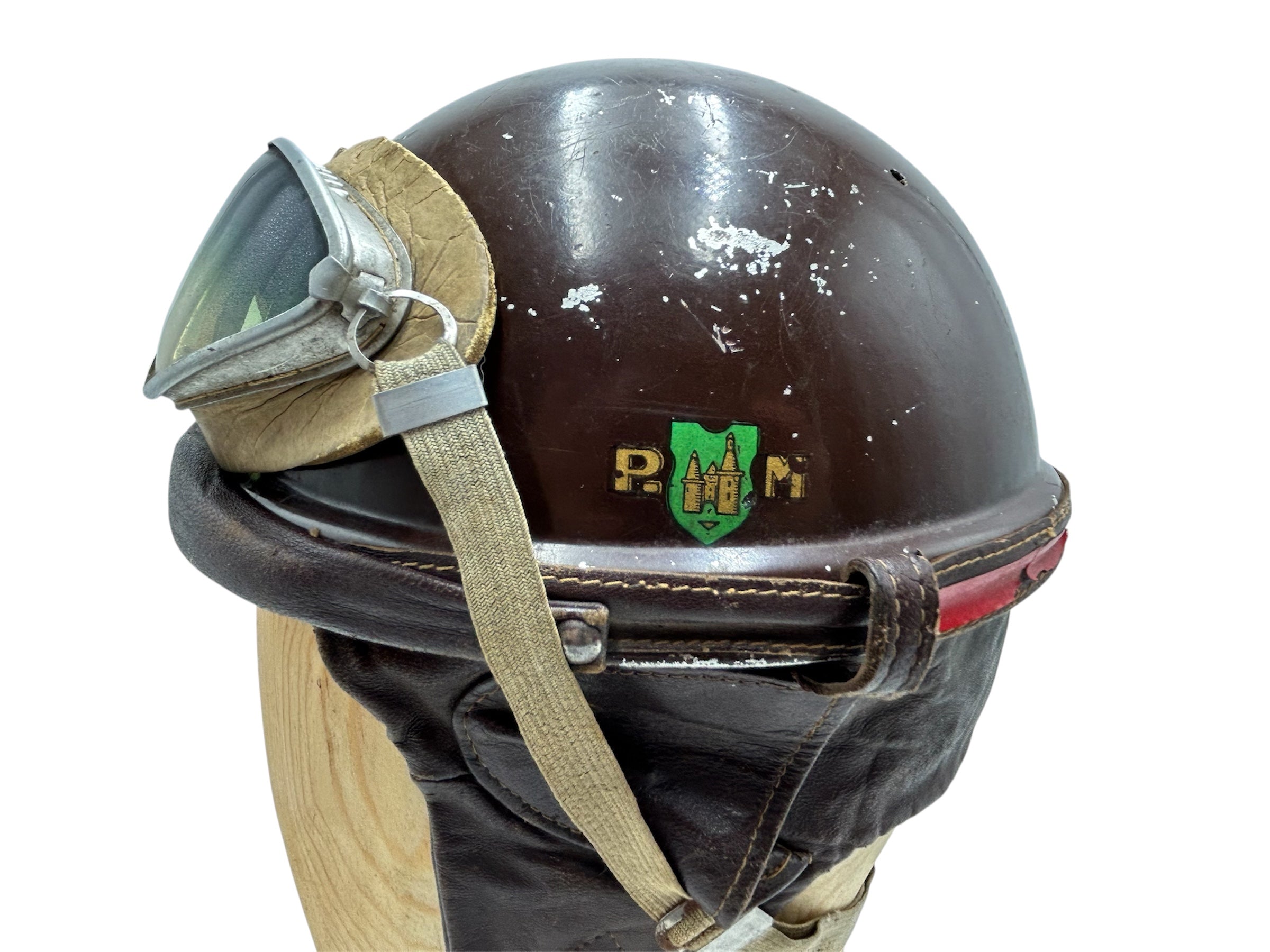 Vintage Motorcycle Crash Helmet with goggles. Helmet made by P.M. 1950s maybe Italian or English.